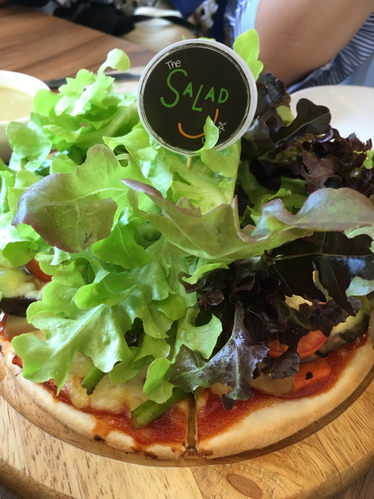 พิซซ่าสลัด ผักมาเป็นดงเลย ผักสดกรอบอร่อยดี แต่พอกินรวมๆ แล้ว ส่วนตัวรู้สึกไม่ค่อยชอบเท่าไหร่