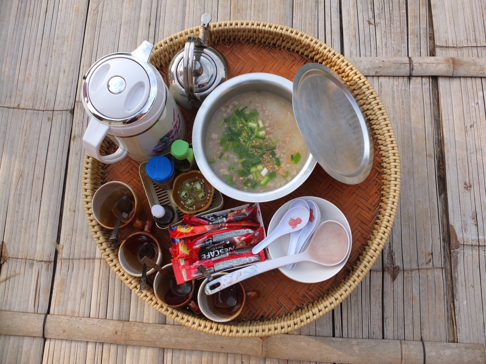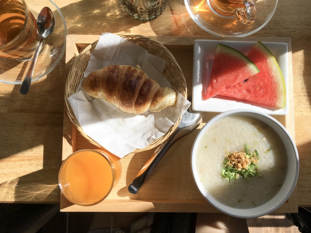 เริ่มวันสบายด้วยโจ๊ก น้ำส้ม ชา ครัวซอง แตงโม เอิ่ม จัดเต็มตั้งแต่เช้าเลย พี่เจ้าของจัดเอง เสริฟเอง อีกหนึ่งความใส่ใจของที่นี่ น่ารักอ่ะ