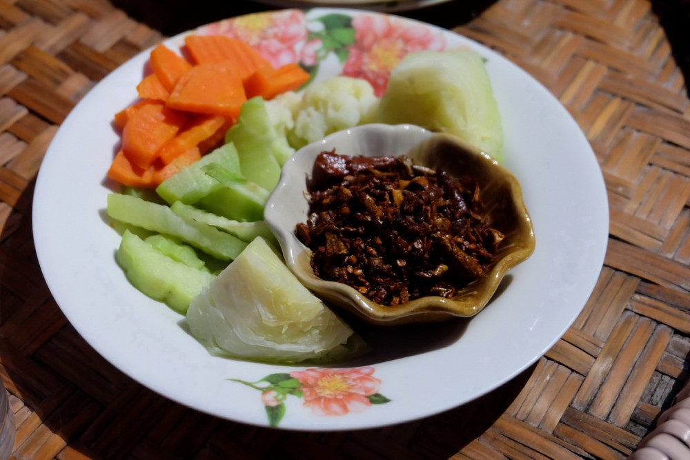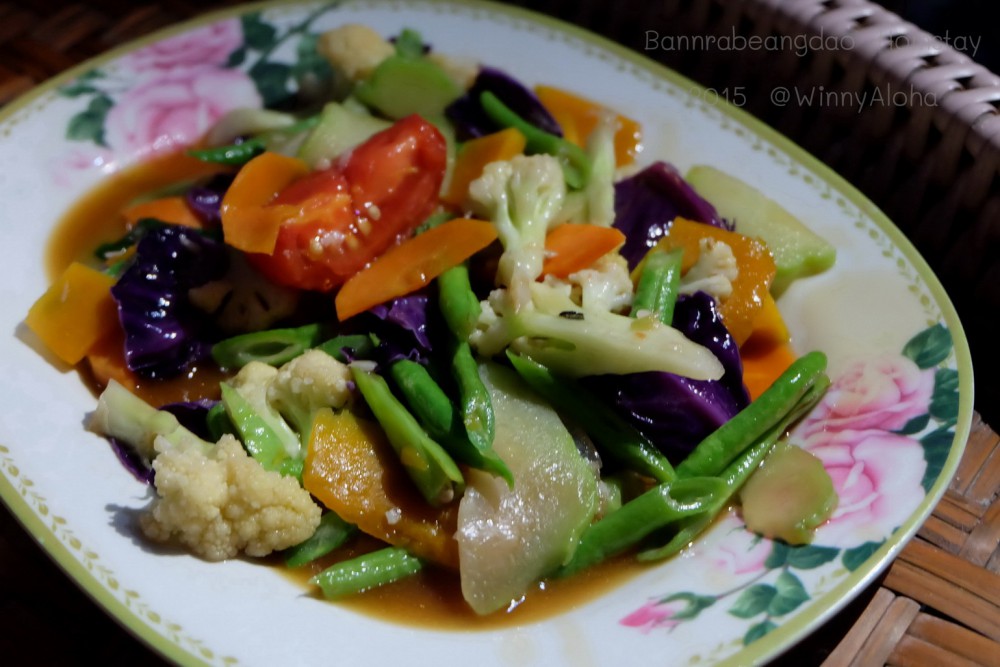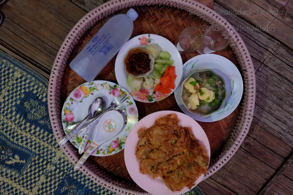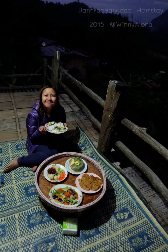 เย็นนี้เราขอนั่งทานข้าวเย็นริมระเบียงบ้าน ประมาณหกโมงพี่เค้าจะยกสำรับอาหารมาให้ มีข้าวหนึ่งหม้อ ผัดผัก ต้มจืด ไข่เจียวและของเด็ดน้ำพริกลีซอ น้ำพริกนี่สมคำร่ำลือจริง หอมพริกทอดและเผ็ดสุดใจ แต่เผ็ดขนาดไหนเราก็กวาดน้ำพริกกันหมดเรียบ 555 คืนนี้อากาศเย็นประมาณสิบองศากว่าๆ กลางคืนท้องฟ้ามืดสนิทนอนมองดาวจากระเบียง สุขสุดๆ