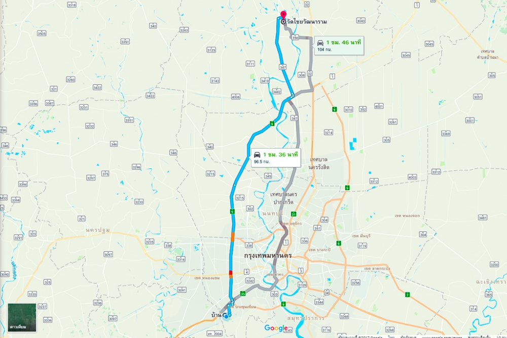วงกลมแดงกับเส้นทางเข้าออกวัดที่เป็นทางซีเมนต์ยาวประมาณกิโล สองกิโล ซึ่งเจ้าวงกลมนี้คือจุดที่ในหลวง ร.9 ขับรถมาชนนั้นเอง ด้านขวาของภาพนั้นเป็นเหวนะ