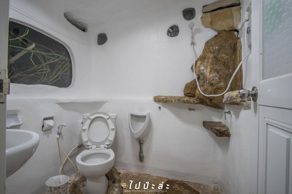 - บ้านถ้ำ ดูจากภายนอกจะเข้าประตูยังต้องก้มหัวเลยแต่พอเข้าไปด้านในเท่านั้นแหล่ะ โอ้ววววว เป็นไปได้ยังไง มันกว้างกว่าที่คิดไว้มาก แบ่งเป็นส่วนของห้องนั่งเล่นและห้องนอนอีกต่างหาก พร้อมห้องน้ำในตัว ภายในจะโบกปูนแบบไม่ให้เรียบครับให้ได้บรรยากาศแบบอยู่ในถ้ำ อ้อบ้านหลังนี้ด้านบนจะเป็นดินแล้วก็ต้นไม้ต้นหญ้าปกคลุมอยู่ครับทำให้ตัวบ้านนั้นไม่ร้อน ไฮไลท์อีกอย่างอยู่ในห้องน้ำครับ เจ้าของออกแบบให้มีน้ำตกเล็ก ๆ ในห้องน้ำด้วยครับเผือใครอยากได้บรรยากาศการอาบน้ำแบบเล่นน้ำตก