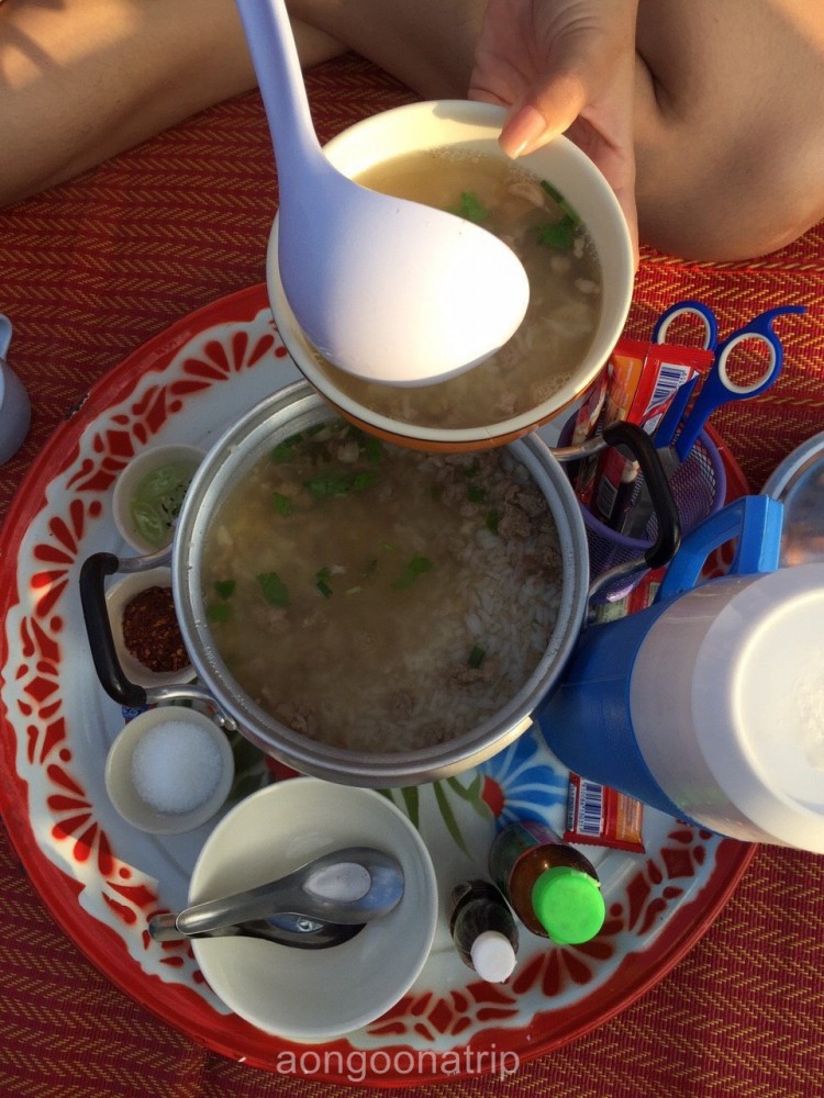07.00 น. จิบกาแฟ โอวัลตินร้อนๆรับแสงแดด พอเราตื่นปุ๊บน้องจะรีบเอากาแฟมาเสริฟเลยค่ะ (ขอบอกว่าเมื่อคืนน้ำค้างหนามาก เต๊นท์และที่านั่งเปียกหมด) แล้วต่อด้วยข้าวต้ม