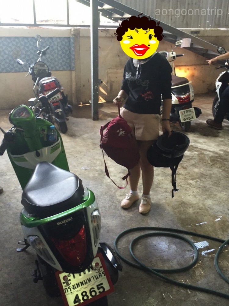 09.00 น. จากนั้นเดินออกจานครชัยแอร์ออกมาด้านหน้าอาเขต มองทางขวามมือเดินไปฝั่งโรงแรมไดมอน แกรด์ จะเห็นร้าน bikky เห็นคนเช่ารถร้านนี้เยอะมาก เราก็ไปแจ้งที่จองรถ ร้านนี้บริการดีมากลงข้อมูลถ่ายสำเนาถ่ายรูปเรากับรถ ค่าเช่าวันละ 250 บาท น้ำมันเติมเอง และรถสามารถส่งที่สนามบินได้ด้วยเสียเพิ่ม 50 บาท เราเช่า 2 วันค่ะ อ่อ ลืมบอกว่าที่นี่มีหมวกกันน็อคฟรีแบบครึ่งใบ ถ้าอยากได้เต็มใบก็เสียเงินเพิ่มตามแบบค่ะ