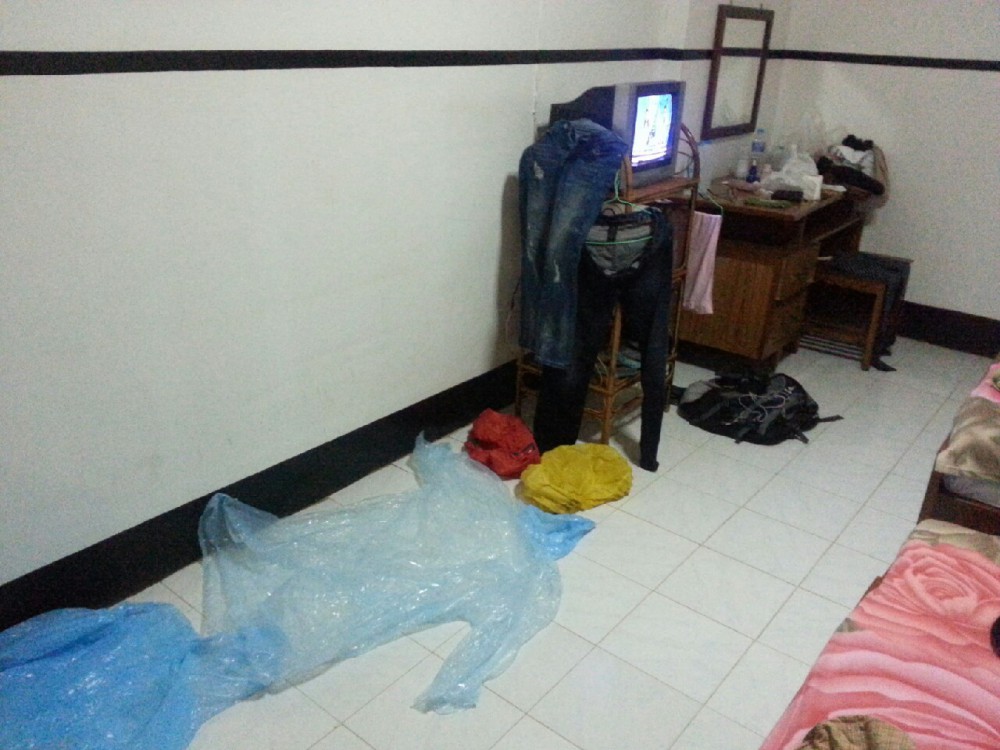 ถึงอุบลฯประมาณเที่ยงกว่าๆ หิวมากสั่งข้าวมันไก่(ข้าวบูด) โชคชะตาช่างโหดร้าย เดินทางต่อด้วยรถตู้ค่ารถ 100 บาท ถึงช่องเม็ก ค่าผ่านเข้าเมืองลาวอีก 100 บาท ต่อด้วยรถตู้เมืองลาวเหมาๆแปดคนคิด 800 บาท หารลงตัว(เค้าเรียกเรา1000บาท) ถึงปากเซเกือบๆหกโมงเย็น ที่พักคืนแรกของเราราคา 500 บาท ตั้งชื่อว่าคฤหาสท่านแด็กฯ...สภาพเปียกอนาจ