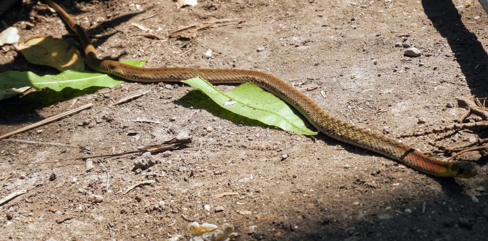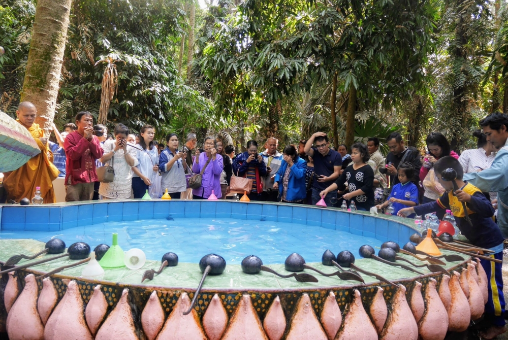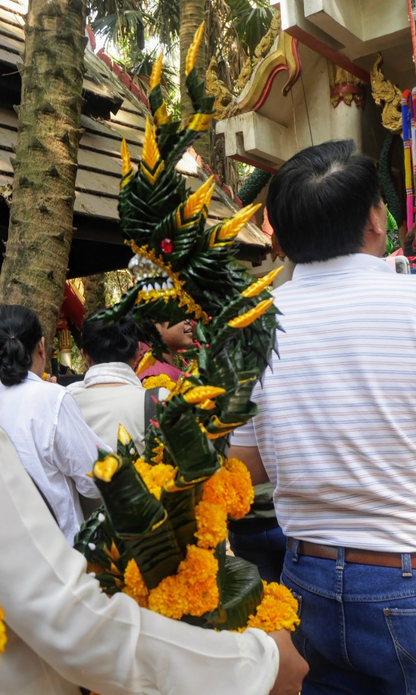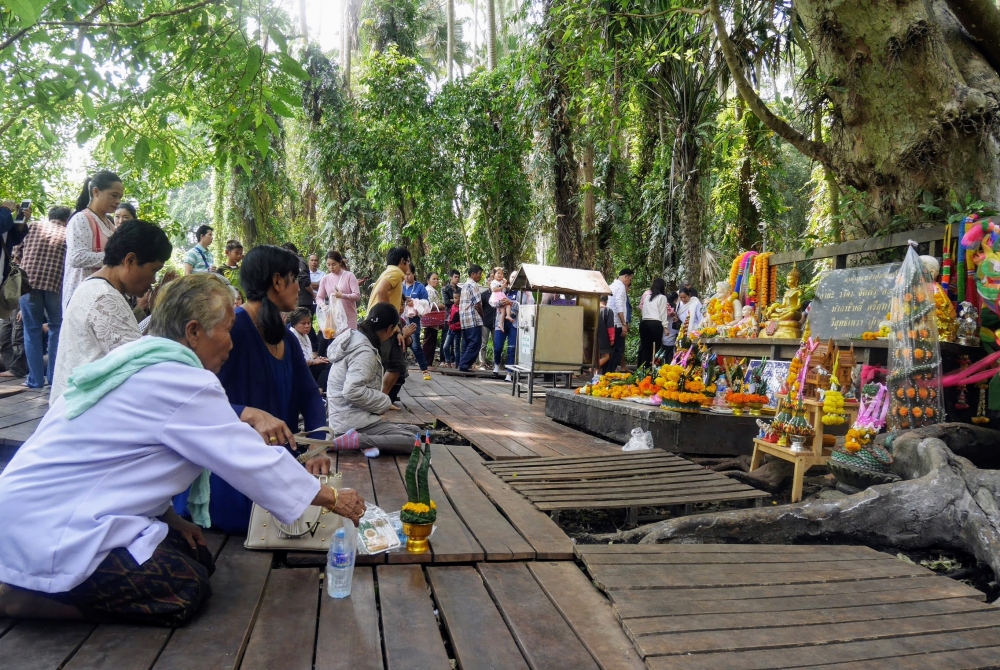 ระหว่างทางที่เดินเข้าไป ผู้คนถือพานบายศรีเป็นรูปพญานาคที่สวยงามเพื่อกราบไหว้และบนบาน สังเกตผู้คนที่เดินเข้าไปต่างเอามือลูบลำตัวรูปปั้นพญานาคไปด้วย แต่เรากำลังแปลกใจกับภาพตรงหน้าที่มีความชุ่มฉ่ำและร่มเย็นของต้นไม้ต่างจากด้านนอกที่ดูร้อนและแห้งแล้ง พอมาถึงผู้คนยิ่งหนาตา บวกกับความร่มรื่นของต้นชะโนดที่สูงลิ่ว ชะงักเล็กน้อย มองไปรอบๆ ผู้คนส่งเสียงเฮเป็นช่วงๆ และรุมกันมุงดู บ้างส่งเสียงเรียกญาติหรือเพื่อนที่มาด้วยให้มาช่วยดู ไอ้เราก็พลอยสงสัยว่ามุงดูอะไรกัน ก็เข้าไปถามจนรู้ว่าเขาเห็นงูบ้าง กระรอกบ้าง ตีเป็นตัวเลขกันไป อารมณ์ตรงนั้นพลอยตื่นเต้นไปกะเขาด้วยเรียกได้ว่าสถานการณ์พาไป แต่เราดันไม่เห็นอะไรเลยนี้สิ 5555 ก็ว่ากันไป