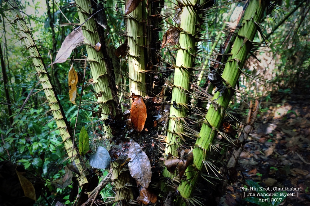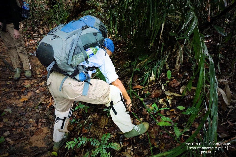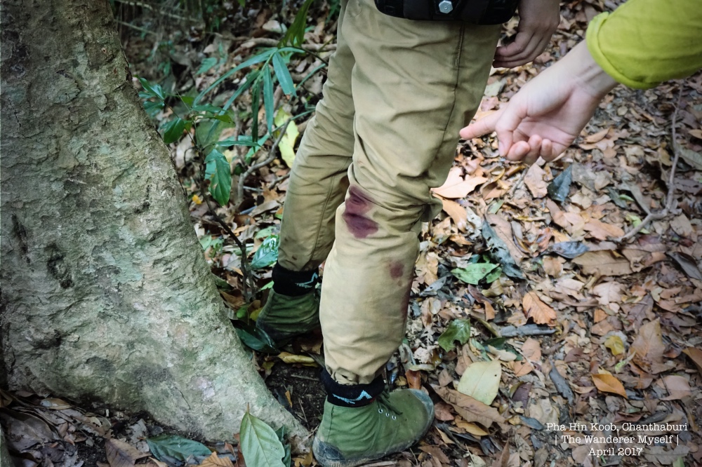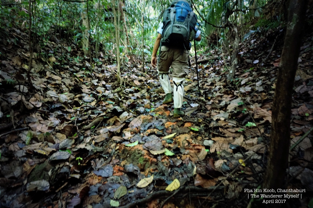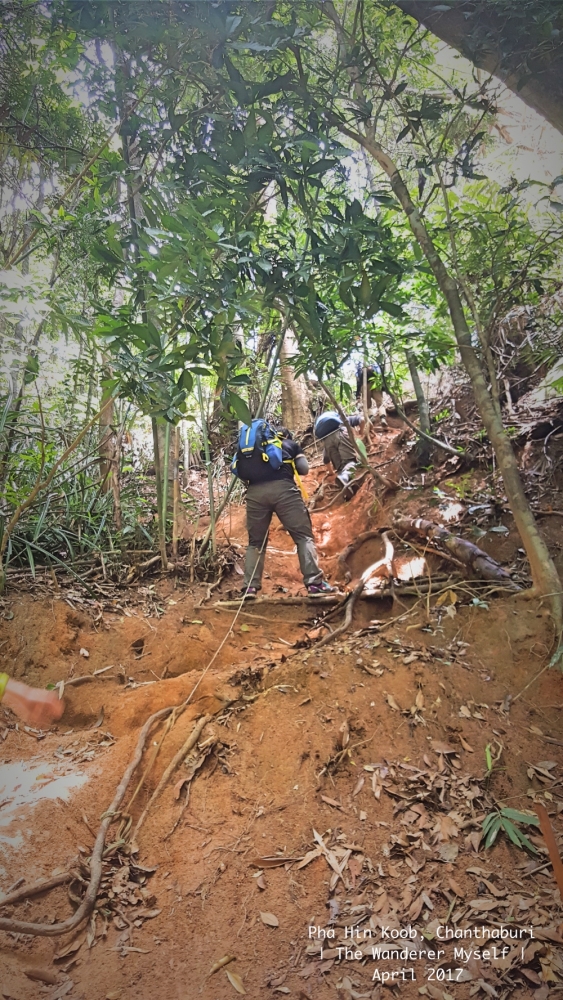 > คณะเราเริ่มออกเดินเวลา 8:30 น. เป็นกลุ่มแรก เพื่อจะได้รีบขึ้นไปจับจองพื้นที่ทองใต้หลังคาหน้าผา > ช่วงเริ่มต้น สองข้างทางจะมีต้นระกำอยู่มากมาย ควรระมัดระวัง > ความชันที่ต้องเจอตลอดทาง 7-8 กม. > บางคนรู้ตัวทันน้องทาก ก็ยังพอดีดทัน > แต่บางคนไม่ทันจะรู้ตัว ก็โดนเจาะยิงไปหลายนัด > ระหว่างทางมีสัตว์โลกให้ได้เห็นประปรายรายทาง > กลมกลืน