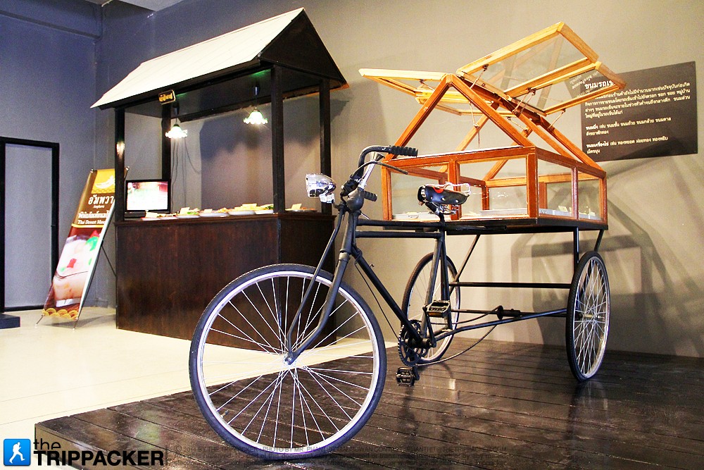 ซึ่งคำตอบก็อยู่ในพิพิธภัณฑ์ส่วนแรกนั่นเองโดยทันทีที่เราเข้ามายังส่วนจัดแสดงนี้ข้อสงสัยต่างๆก็กระจ่างลงเมื่อข้อมูลบอกว่าขนมต้มที่ ใครหลายคนไม่ค่อยนึกถึงนั้นจะเป็นขนมไทยดั่งเดิมแท้ๆและไม่ได้รับอิทธิพลมา จากที่ใดอีกด้วยทั้งนี้ในส่วนจัดแสดงอื่นๆที่รอให้ได้ชมก็ค่อนข้างน่าสนใจ อย่างส่วนถัดไปก็จะอธิบายว่าขนมไทยในยุคสมัยตั้งแต่สุโขทัยอยุธยากระทั่ง สมัยรัตนโกสินทร์เป็นอย่างไรมีความต่อเนื่องหรือเปลี่ยนแปลงแค่ไหนหรือใน ส่วนของขนมมงคล 9 อย่างก็มีแบบทำจำลองให้ได้ชม หน้าชื่นตาด้วยเช่นกัน ทั้งนี้ถ้าจะบอกว่าการจะได้เห็นขนมทั้ง 9 อย่างพร้อมๆ กันนั้นไม่ใช่เรื่องง่ายอีกต่อไปก็คงจะได้ และไม่เพียงแต่ขนมไทยหาทานยากทั้งหลายเท่านั้น ยังมีการจัดแสดงขนมไทยแบบบ้านๆ ที่น่าจะคุ้นตาพวกเราไม่น้อย ทั้งการจำลองร้านน้ำแข็งไสที่สามารถเห็นวิธีการไสน้ำแข็งใสแบบเก่าๆ ที่นำแผ่นไม้มาตอกตะปูเพื่อเป็นตัวยึดก้อนน้ำแข็ง แล้วไสไปบนแผ่นไม้ที่ฝังด้วยใบมีด รวมถึงจำพวกขนมอื่นๆ เช่น ขนมโหล ที่วางอวดโฉมอยู่มากมายทั้ง ข้าวตู มะตูมเชื่อม อาลัวและอื่นๆ ดูไปแล้วก็อดนึกย้อนไปเมื่อคราวเป็นเด็กที่ต้องเขย่งเท้าเพื่อเปิดโหลถั่ว ทอดที่วางบนชั้นในร้านโชว์ห่วยข้างบ้านไม่ได้จริงๆ ในขณะที่แผงข้างๆ กันก็เป็นบรรดาขนมที่ใส่ไว้ในหม้อดินแบบสมัยก่อน ไม่ว่าจะเป็น ข้าวเหนียวสาคูเปียก ถั่วเขียวต้มน้ำตาล ปากริมไข่เต่า เป็นต้น ว่าแต่ยังไม่หมดเพียงเท่านี้ พื้นที่อีกส่วนหนึ่งยังมีการจัดแสดงพาหนะรูปแบบต่างๆ ที่นำมาใช้ขายขนม ทั้งจักรยานสามล้อพ่วง เรือพาย รถเข็น หาบเร่ และอื่นๆ ให้คุณได้ลองสวมบทเป็นพ่อค้า แม่ค้ามือสมัครเล่น แอ็กท่าถ่ายรูปกับญาติมิตรและเพื่อนฝูงก็คงสนุกดีไม่น้อย