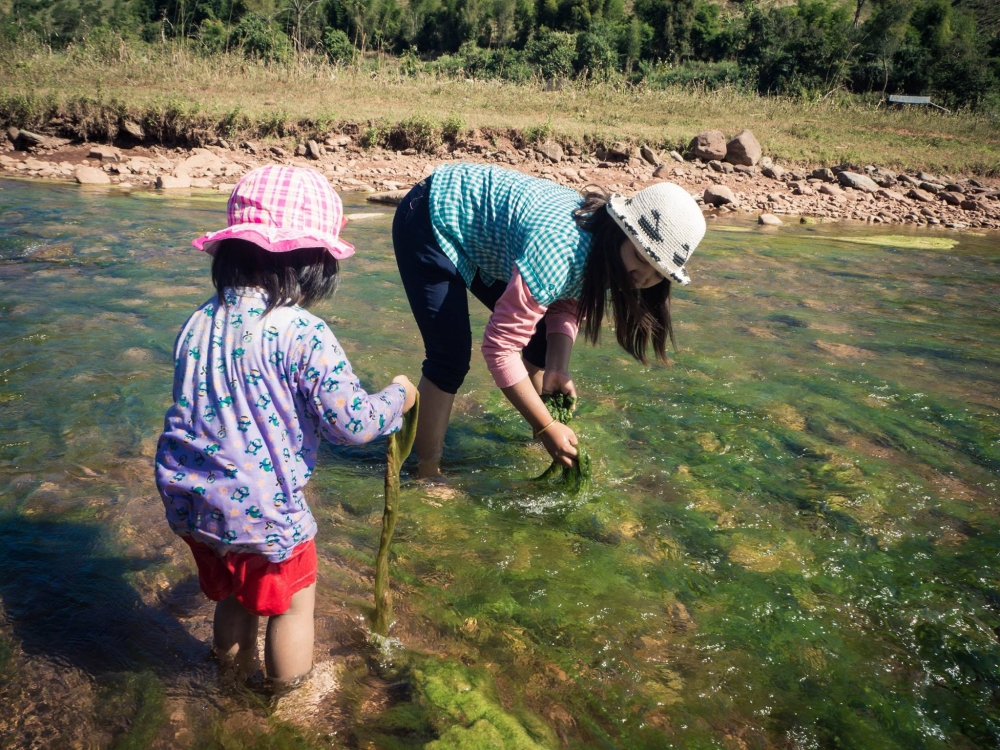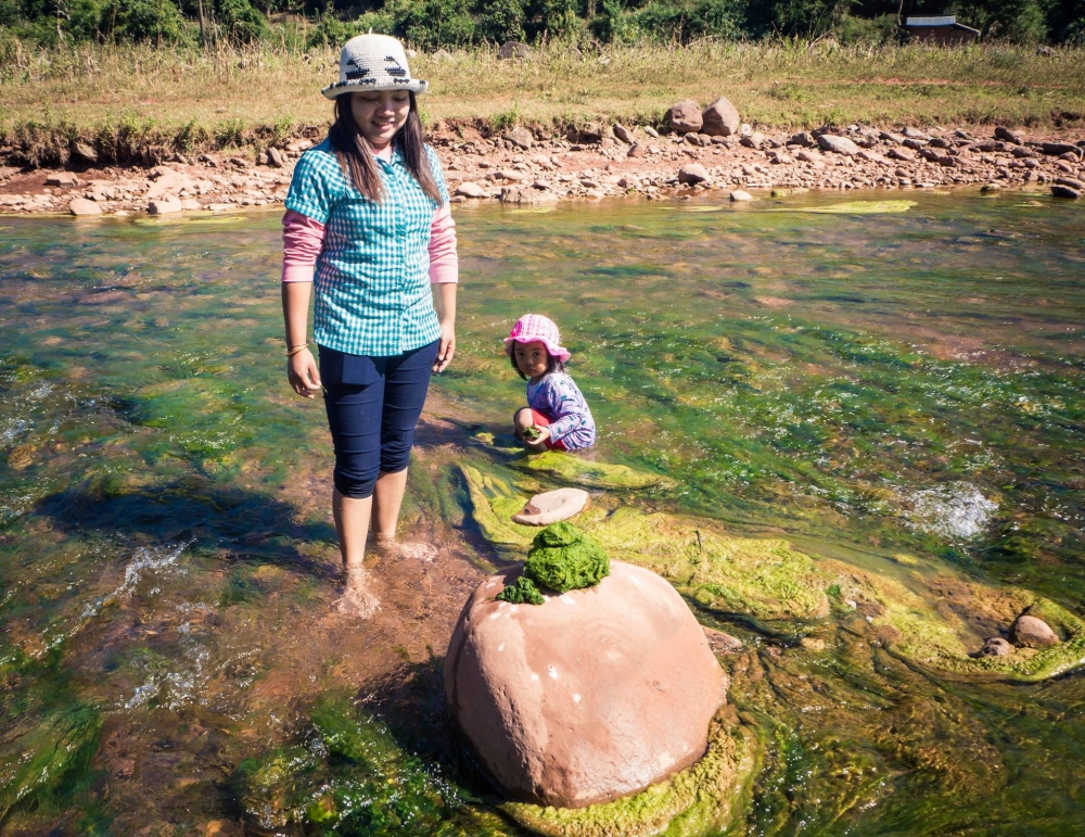 พี่ที่เราโบกรถได้รีบบอกเพื่อนเขา จอดๆๆ แล้วลากเราลงมาถ่ายรูป แล้วก็ชวนคุยกับพี่สาวกับน้องหนูคนนี้ แล้วก็ช่วยเก็บด้วย สอบถามมาว่านี้เรียกว่าไก อ๋อ..เตาน่ะหรอคะ พี่สาวคนนี้บอกว่า ไม่ใช่ เตาจะอยู่ในน้ำนิ่ง แต่นี่เรียกว่าไก จะอยู่ในน้ำไหล จะมีแค่ช่วงเดือนนี้เท่านั้น ถ้าหลังจากนี้ก็จะแก่แล้ว กินไม่ได้