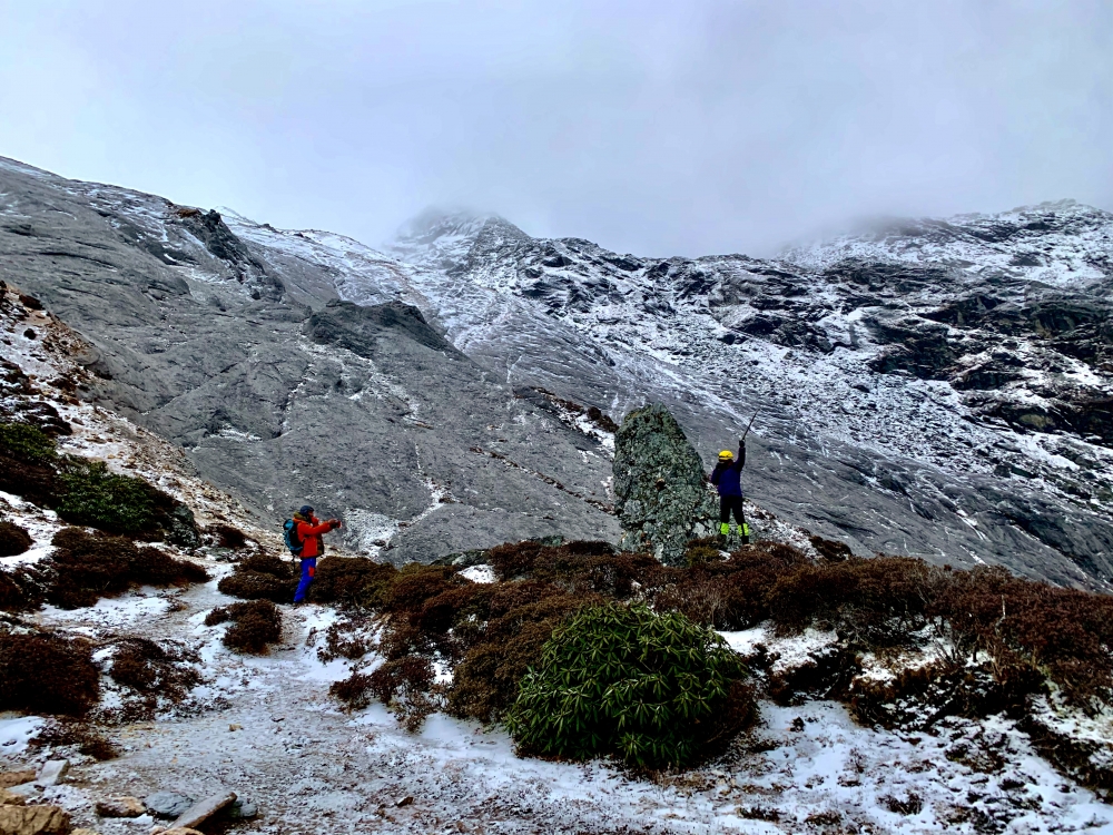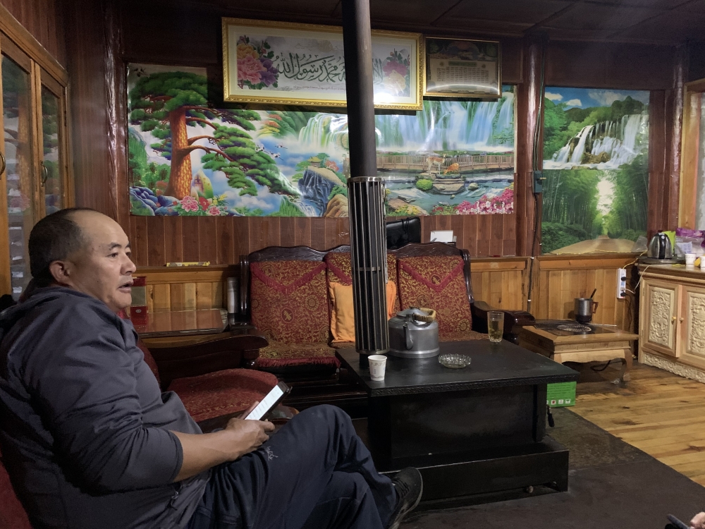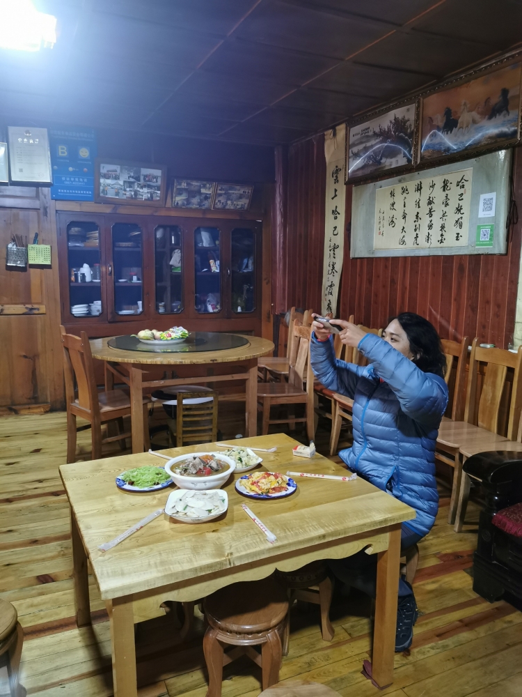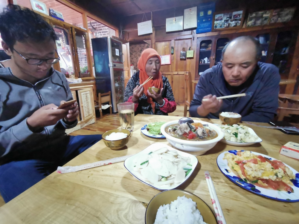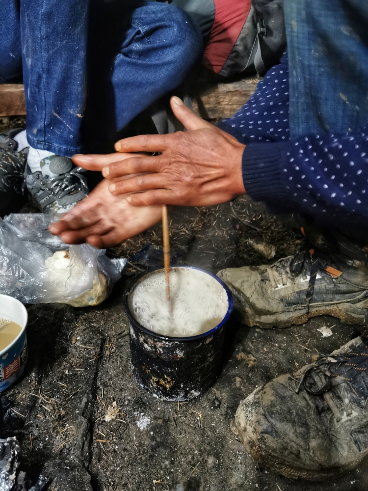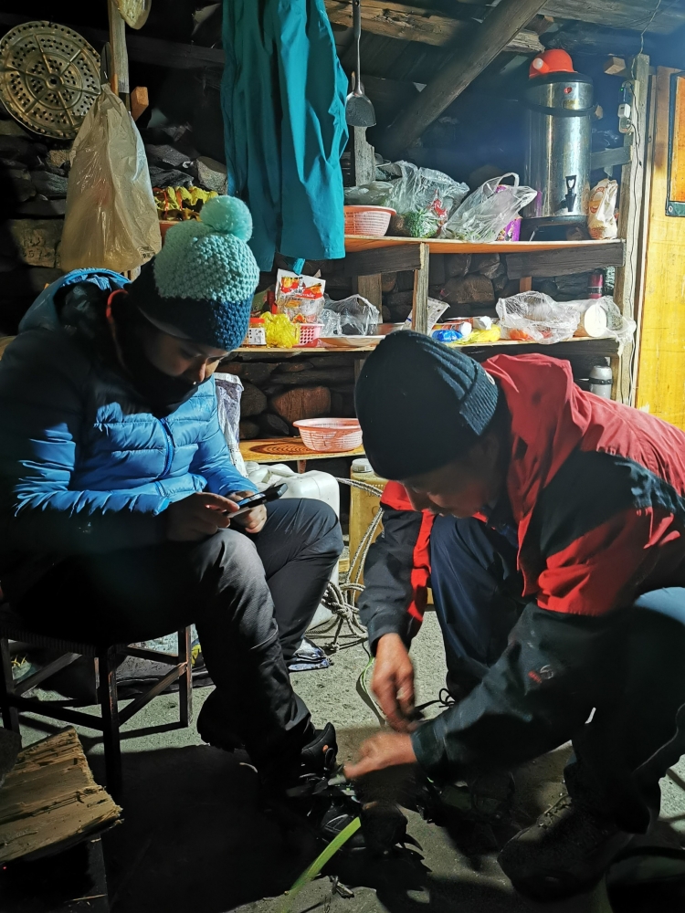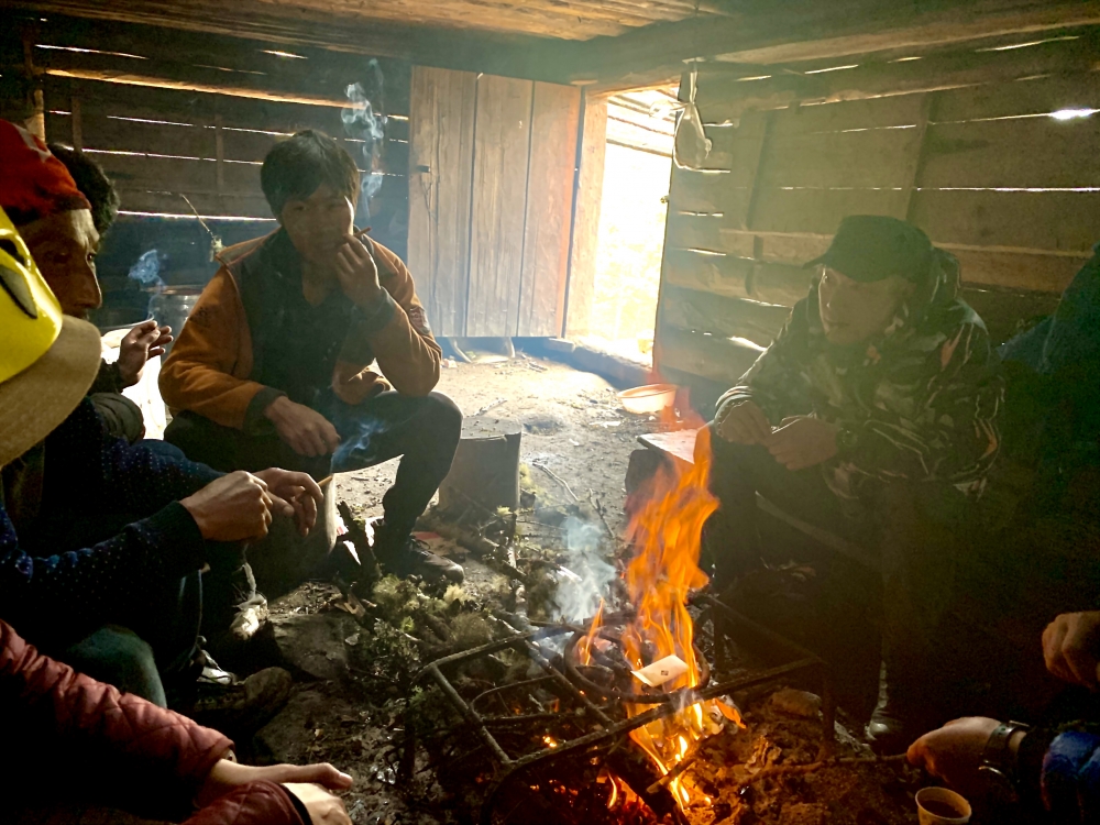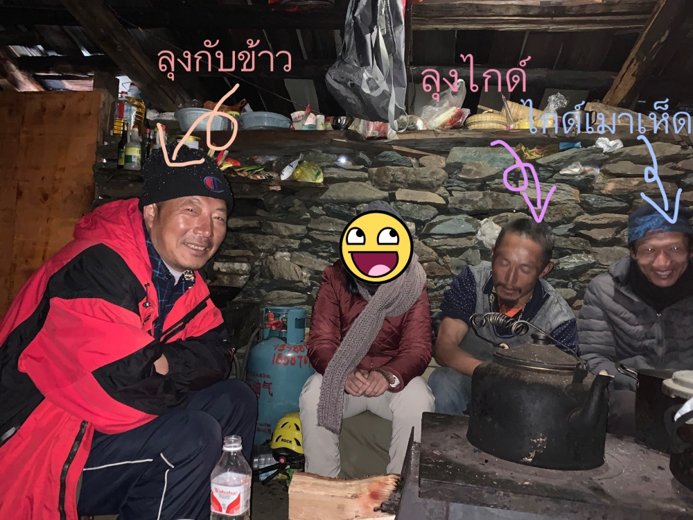 เราก็นั่งรอ ระหว่างรอเราก็กินน้ำ กินน้ำเยอะๆจะช่วยเติม O2 ให้กับร่างกาย แล้วจู่ๆ ก็มีคนเข้ามาในกระท่อมนี้อีก เข้ามาเรื่อยๆเลย เรากับพี่ปุ๋ยก็ขยับเข้ามาด้านในเรื่อยๆๆ คนที่เข้ามาใหม่ เป็นผู้ชายชาวจีนทั้งหมดเลย สักพักลุงไกด์ก็กลับมาพร้อมกับฟืน ตอนนี้นับประชากรชาวจีนที่อยู่ในห้องได้ทั้งหมดก็ 9 คนถ้วน เป็นผุ้ชายทั้งหมด แล้วก็มีต่างด้าวอยู่ 2 คนคือเรากับพี่ปุ๋ย พวกนางเข้ามาปุ๊ปก็สูบบุหรีปั๊ปเลย มวนต่อมวนเลย ถ้าจะให้มองว่าน่ากลัวก็น่ากลัวนะ เพราะเขาเป็นผู้ชายทั้งหมดเลย และเราไม่รู้ภาษาของเขาด้วย แต่ว่าหลังจากที่ได้ทักทายแล้ว ก็ค้นพบว่า พวกเขาเป็นคนตลก
