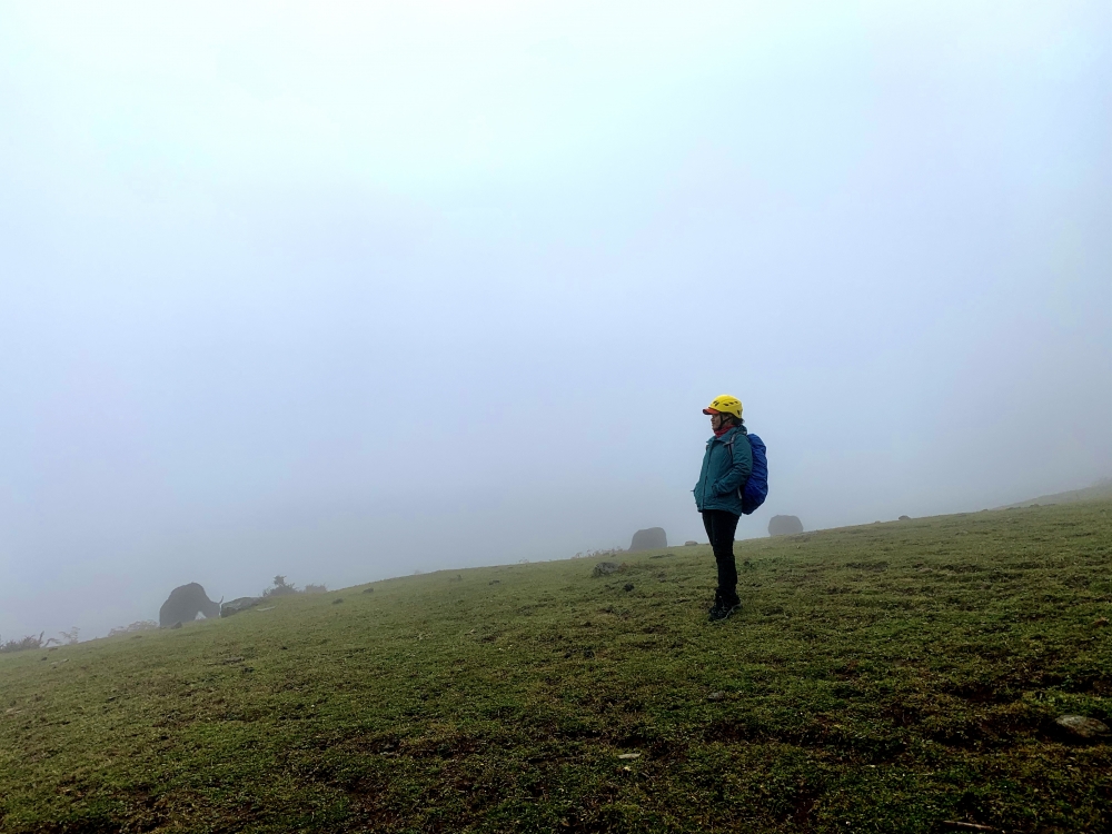 ระหว่างที่เราถ่ายรูปกันอย่างมัวๆ เพราะหมอกเยอะมาก ฟ้าไม่เปิดเลย เราก็เหลือบเห็นจามรีน้อยกำลังวิ่งตรงมาทางเรา นางวิ่งเร็ว วิ่งได้น่ารักมากๆ แต่พอเราหันหน้าไปหานางตรงๆ นางเบรกหัวถิ่มเลยจ้าาา ฮ่าๆๆๆ น่ารักมาก เห็นได้ชัดว่า จามรีเป็นสัตว์รักสงบ ไม่อยากยุ่งกับคน ไม่ทำร้ายคน แต่ก็เป็นสัตว์ที่แอบติดตลกเหมือนกัน จามรีน้อยหัวถิ่มเลย