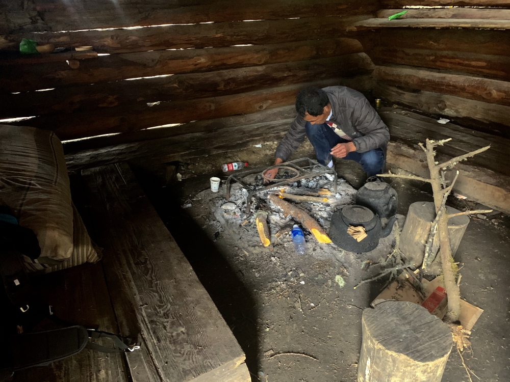 เดินไปเรื่อยๆ ก็เจอกระท่อมหลังน้อยหลังหนึ่่ง ลุงไกด์ก็ให้พักอีกครั้ง ครั้งนี้ดูเป็นการพักกลางวันเพื่อกินข้าว ลุงให้เราเข้าไปในกระท่อมนั้น พอเดินเข้าไปก็เห็นเครื่องครัวต่างๆอยู่ทางขวามือ ทางซ้ายเป็นที่นั่ง แล้วก็มีกองไฟที่มอดแล้วอยู่ตรงกลาง ลุงแกก็จัดเตรียมของกินให้เราสองคน แล้วมีลุงอีกคนนึงที่เจอกันระหว่างทางก็เข้ามานั่งด้วย มาก่อไฟให้ ดูเหมือนว่าแกจะเป็นไกด์เหมือนกัน พูดคุยกันเหมือนสนิทกันมากๆ