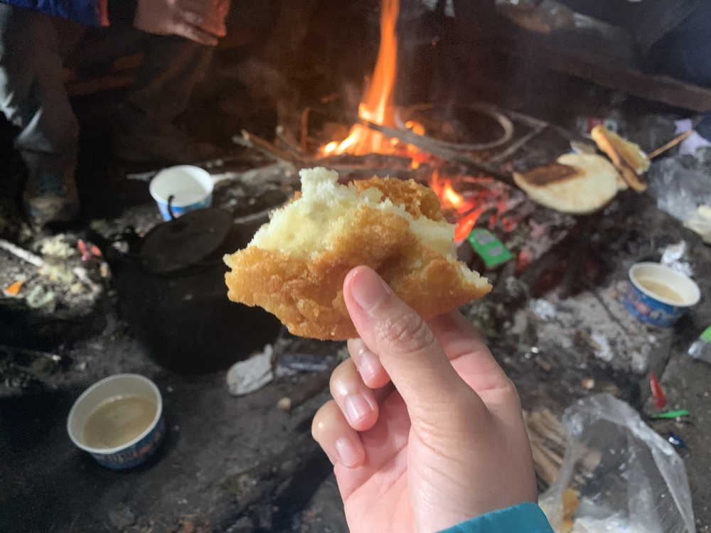 กลับมาจากห้องน้ำที่ไม่มีจริง ก็มีชาร้อนๆรอเราแล้ว พร้อมกันขนมกลางวัน มันคือแป้งทอดฉ่ำๆน้ำมันนิดนึง มีรสชาติหวาน แต่ว่าคนเสื้อส้มกับเพื่อนๆเขากินแผ่นแป้งกัน โดยต้องเอาไปปิ้งกับไฟก่อน นางก็แบ่งให้กิน แหม่มีน้ำใจมากๆอ่ะ รสชาติจะจืดๆมันๆแห้งๆ นิดนึง ก็กินได้ให้ร่างกายมีพลังงาน ฮ่าๆๆ