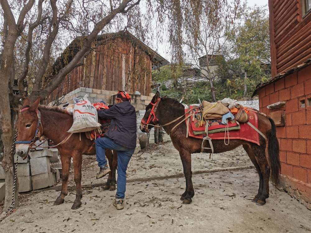 หลังจากกินเสร็จเรียบร้อยแล้ว เราก็เก็บของออกเดินทางกัน พอออกไปหน้าบ้าน ก็เห็นลุงอีกคนนึงมาเก็บของ เราขอเรียกว่าลุงไกด์ละกัน แกก็เอาของของเราใส่กระสอบรวมถึงอาหารด้วย มองไปหน้าบ้านลุงเห็นม้า 2 ตัวมารอแล้วววว เย่!!! จะได้ขี่ม้าแล้ว นี่เป็นการขี่ม้าครั้งแรกของเราเลยนะ แถมครั้งนี้Advance เข้าไปอีก เพราะเป็นการขี่ม้าขึ้นเขา!!! แต่อ่าวววว ลุงไม่ให้ขึ้นอ่ะ เห้ยลุง หลอกกันป่าวเนี่ย เรากับพี่ปุ๋ยก็ทำหน้างงๆ มองหน้าลุงแบบงงๆ ลุงแกเลยชี้ไปทางโน้นนน ทางที่เรากำลังจะไป พวกเราก็เข้าใจเอาเองว่า อ๋ออ เดี๋ยวให้ไปขึ้นตรงโน้นนนนมั้ง ลุงเปาแจกหมวกกันกระแทกให้พวกเราคนละใบ แล้วก็โบกมือบ้ายบายลุงเปา แล้วก็เดินตามลุงไกด์ไปเรื่อยๆ