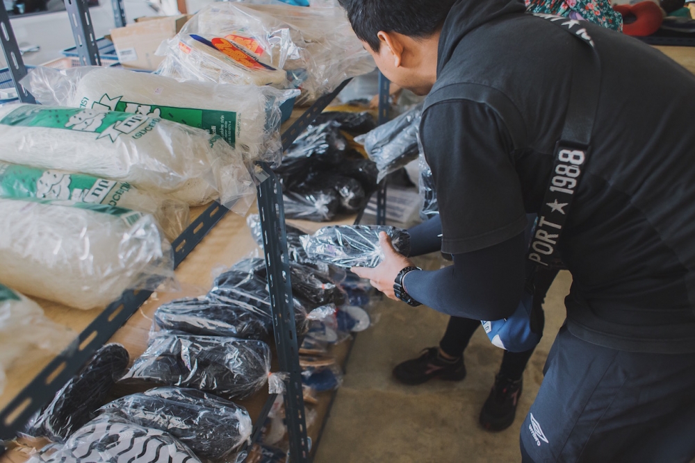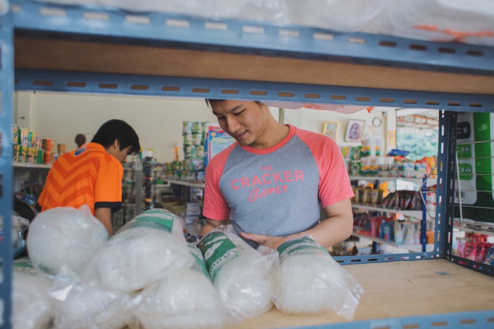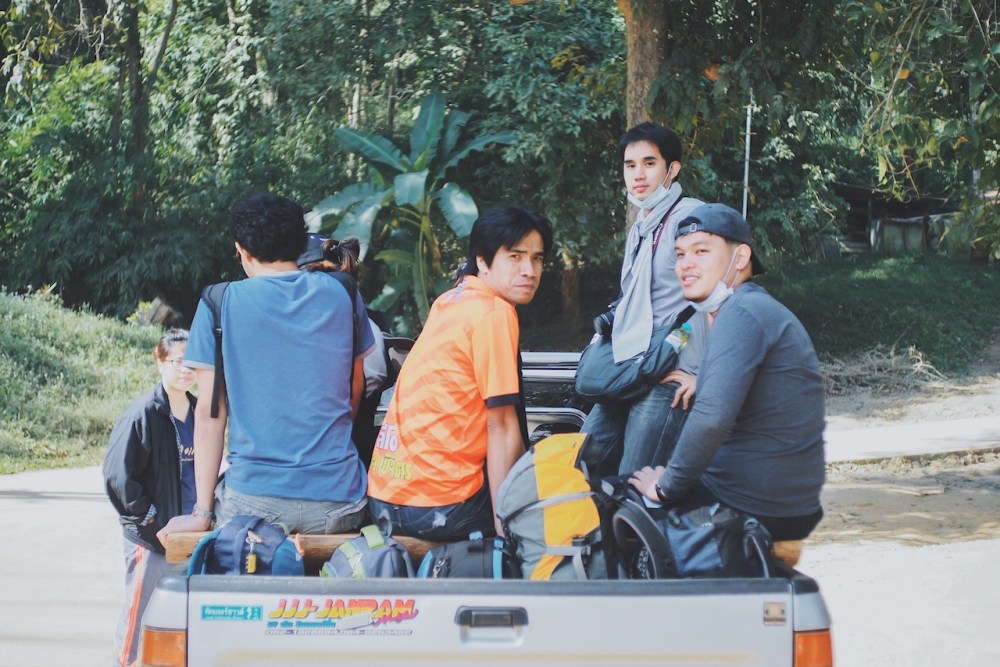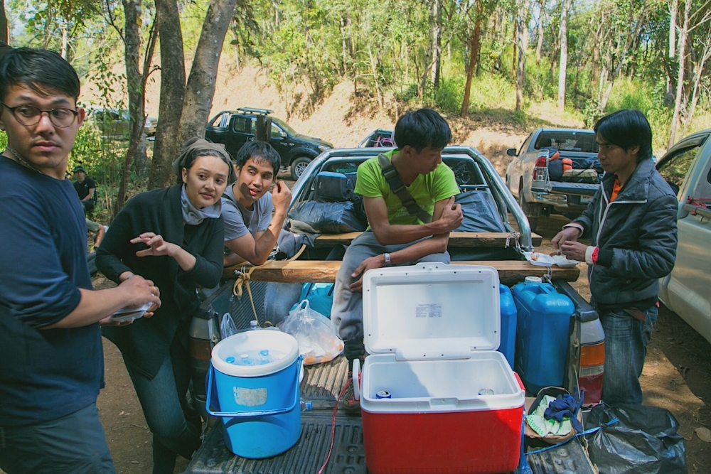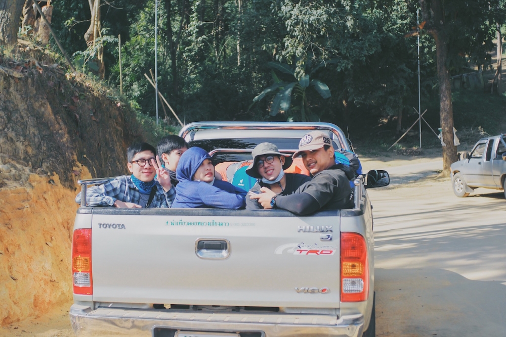เตรียมของกันเสร็จแล้ว พี่ๆ ก็แจกข้าวกลางวัน + น้ำดื่มกันคนละชุด จากนั้นก็โดดขึ้นหลังกระบะกันได้เลย