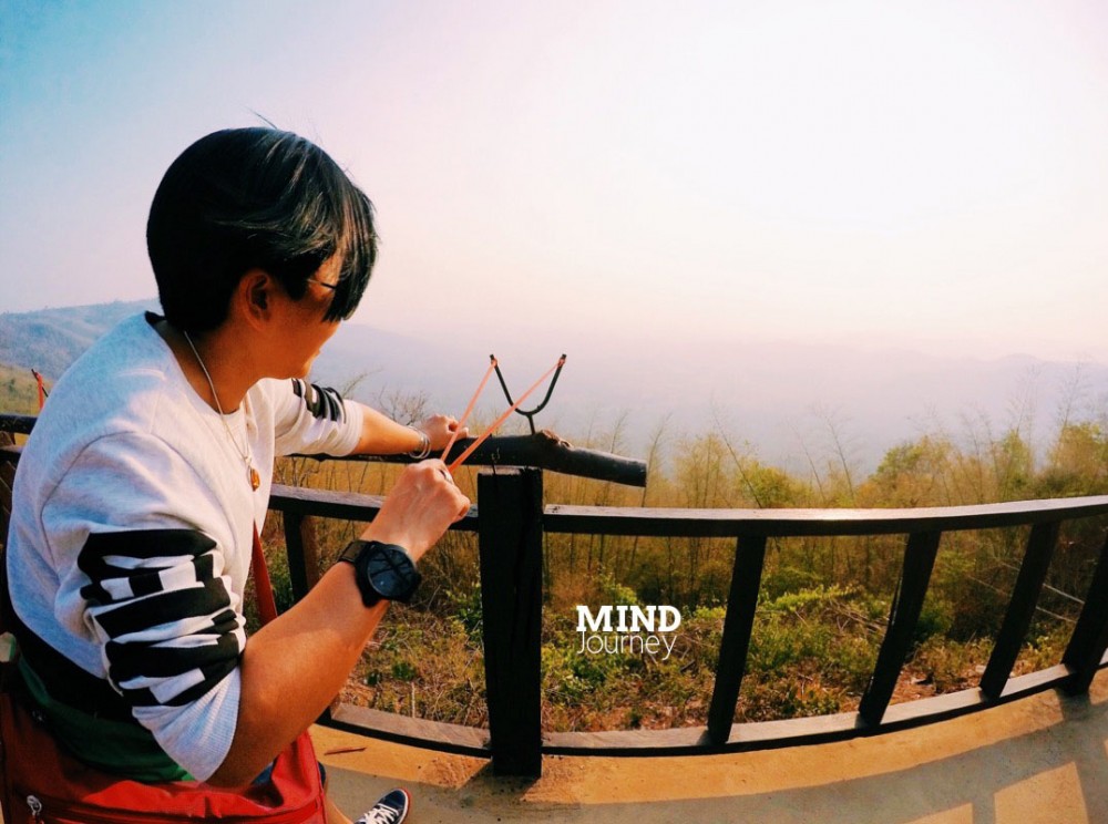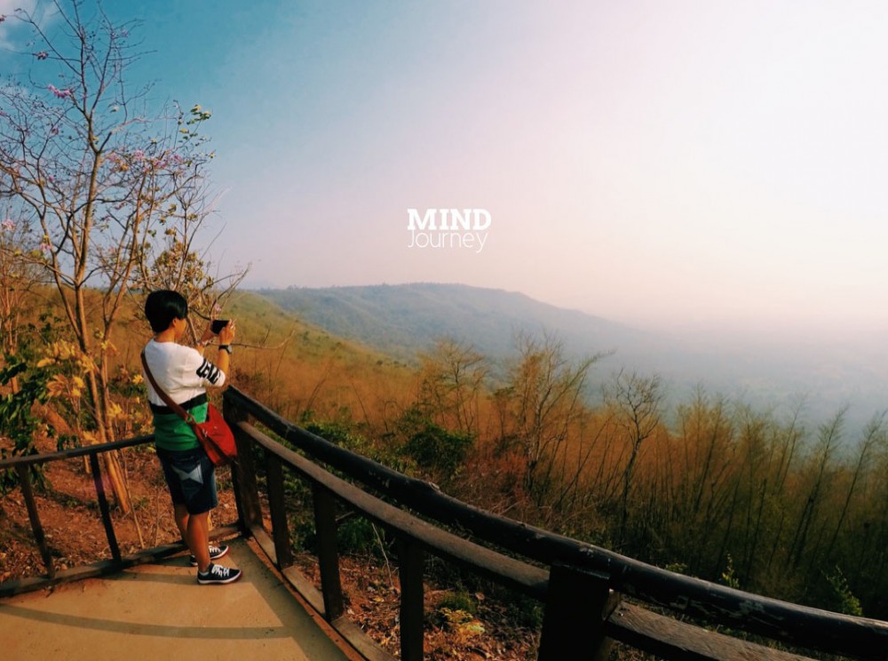 เส้นทางขึ้นเขาไม่ชันมากนัก แป๊บเดียวก็ถึง เมื่อขึ้นไปถึงจะมองเห็นลานจอดโล่งๆ กว้างๆ เป็นอย่างแรก ร้านค้าเล็กๆ บ้านต้นไม้และจุดชมวิวแบบพาโนราม่าที่เราตามหา ยอมรับว่าบนผาเก็บตะวันแห่งนี้ อากาศปลอดโปร่ง บรรยากาศดี และมีวิวที่สวยงาม ตามราวไม้กั้นกันตกที่วางเป็นแนวยาว จะมีหนังสติ๊กยึดติดไว้ ใช้ยิงเมล็ดพันธุ์พืชให้ไปตกในป่าข้างล่าง เป็นกิจกรรมดีๆ ที่มาแล้ว ช่วยกันคนละไม้ละมือ 'ปลูกป่า' ด้วยกันค่ะ :)