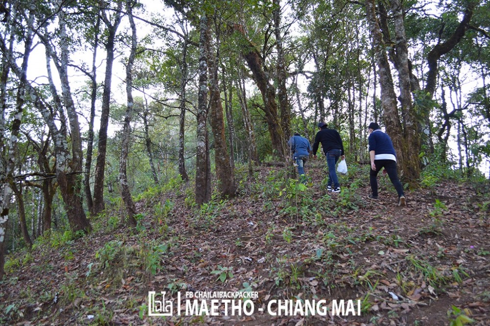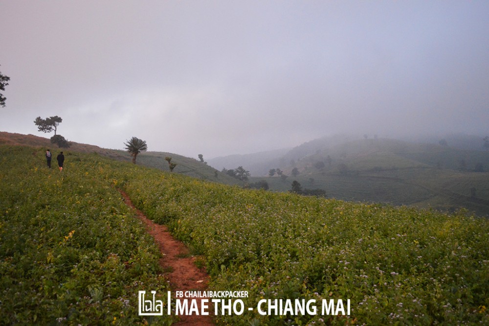 ถัดจากลานกางเต็นท์ไปจะเป็นเส้นทางเดินป่าแล้ว ถ้าเหมารถ 4WD จากโครงการหลวงมาจะสิ้นสุดได้แค่ตรงนี้ หรือ ถ้าหากสภาพทางไม่ดี ถนนลื่น ก็ อาจจะสิ้นสุดตั้งแต่บริเวณทุ่งหญ้าสะวันนาก็ได้ ซึ่งต่อจากนี้จะเป็นเส้นทางเดินป่าที่แคบ  เราจอดมอเตอร์ไซค์ริมทางตรงถนนเล็กๆ ด้านล่าง ดูเหมือนว่าเป็นเส้นทางที่ต้องใช้มอเตอร์ไซค์สัญจรได้เท่านั้น ซึ่งเส้นทางต่อจากนี้ไปต้องเดินเท้าขึ้นเขาเท่านั้น เวลาไม่คอยท่า.. ต้องทำเวลาพอสมควร เพราะต้องการขึ้นไปให้ทันชมบรรยากาศพระอาทิตย์ตก ซึ่งระหว่างทางที่เดินไปนั้นก็ค่อนข้างชัน ต้องเตรียมร่างกายมาให้พร้อม และ อย่าลืมติดน้ำเปล่าไว้ไปดื่มระหว่างทางด้วย