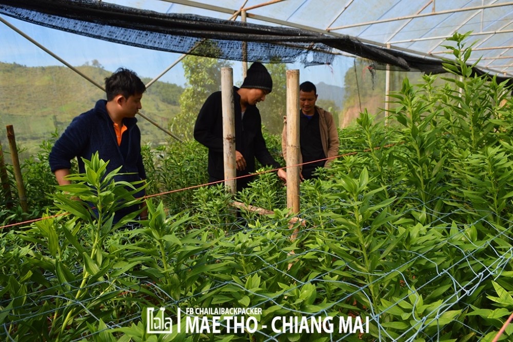 ระหว่างทางกลับไปในตัวโครงการหลวง พี่ชาติได้พาแวะ บ้านเกษตรกรตัวอย่าง เป็นบ้านของ คุณเม่ย(ถ้าเขียนชื่อผิดต้องขออภัยด้วยนะครับ) ที่ภายในบริเวณบ้านได้จัดสรรพื้นที่ในการทำเกษตรกรรม มีทั้งการปลูกพืช และเลี้ยงสัตว์ต่างๆ มีชีวิตเรียบง่ายโดยยึดหลักปรัชญาเศรษฐกิจพอเพียง พี่ชาติขี่มอเตอร์ไซค์นำหน้าพาเข้าสู่ตัวโครงการหลวง พามาจอดรถที่หน้า โรงเรือนไม้ดอก โรงเรือนนี้ คือ โรงเรือนปลูก อัลสโตรมีเรีย ซึ่งเป็นพืชที่สามารถชักนำให้เกิดตาดอกได้ในสภาพที่อุณหภูมิของวัสดุปลูกเย็นอย่างสม่ำเสมอ จะออกดอกก็ต่อเมื่อได้รับความเย็นมากระตุ้นระยะหนึ่ง ฉะนั้นพื้นที่ที่จะปลูกอัลสโตรมีเรียได้ดี จะต้องเป็นพื้นที่ที่มีอากาศเย็น นอกจากนี้ก็ยังมีไม้ดอกชนิดอื่นๆ มากมายให้ได้ชม อวดสีสันสวยงามเต็มโรงเรือน ซึ่งดอกไม้พวกนี้จะส่งต่อไปยังตลาดที่ต้องการต่อไป