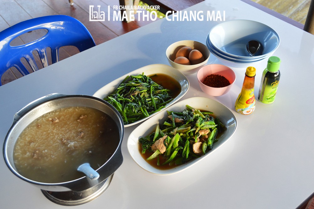 มานั่งกันที่โต๊ะตัวเดิม มุมเดิม เตรียมพร้อมทานอาหารมื้อเช้ากัน ซึ่งมื้อนี้ดูเหมือนจะเป็นอาหารเบาๆ กว่ามื้อก่อน หลักๆ ก็จะเป็น ข้าวต้มหมู มี ไข่ลวก พร้อมผัดผักจากโครงการหลวงอีก 2 อย่าง หน้าตาดูน่าทาน