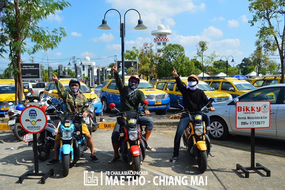 ใช้เวลาในการเดินทางชั่วโมงเศษๆ ก็มาถึง "สนามบินเชียงใหม่" ผมมีนัดหมายกับสมาชิกอีกสองคนที่นี่ จุดนัดหมายของเราก็คือ จุดรับ-คืนรถ ของ Bikky Chiangmai ภายในบริเวณลาดจอดรถของสนามบินเชียงใหม่ เราได้ติดต่อจองรถมอเตอร์ไซค์ กับ Bikky Chiangmai เอาไว้คนละคัน ทั้งหมด 3 คัน เป็นรถมอเตอร์ไซค์ Zoomer X ในราคาเช่าต่อวัน วันละ 300 บาท(เติมน้ำมันเอง) + ค่ารับและคืนรถที่สนามบิน 100 บาท/คัน โดยจะเช่ารถทั้งหมด 2 วัน(48 ชั่วโมง) พอดี ก็รวมเป็นค่าใช้จ่ายทั้งหมด = 700 บาท/คน/คัน(ไม่รวมน้ำมัน)