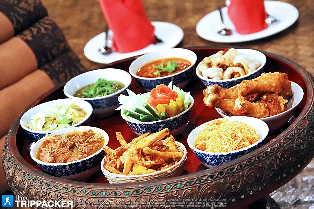 ทั้งนี้ก่อนจะเริ่มลงมือรับประทานเราลองไปทำความรู้จักกับภาชนะใส่อาหารลักษณะเป็นถาดกลมพร้อมขาตั้งสูงที่มีชื่อว่า ขันโตก หรือบ้างก็อาจเรียกว่า สะโตก เจ้าภาชนะชนิดนี้ได้มีการใช้สืบต่อกันมาตั้งแต่สมัยโบราณ ใช้สำหรับวางสำรับเพื่อรับรองแขกเหรื่อที่มาร่วมในงานพิธีต่างๆ รวมไปถึงตามครัวเรือนทั่วไปก็นิยมใช้กันด้วยเช่นกัน แล้วก็มาถึงเรื่องของเมนูที่จัดเรียงมาอย่างน่ารับประทานซึ่งวางอยู่ตรงหน้า เรา ณ ขณะนี้เป็นที่เรียบร้อย ทั้งหมดประกอบไปด้วย แกงฮังเล ผัดผัก ไก่ทอด หมี่กรอบ น้ำพริกอ่อง น้ำพริกหนุ่ม แคบหมู เครื่องเคียงอย่างผักลวกต่างๆ ส่วนข้าวนั้นเราสามารถเลือกได้ทั้งข้าวเหนียวและข้าวสวย ซึ่งรสชาติอาหารนั้นได้ถูกปรับให้คนส่วนใหญ่สามารถรับประทานได้ ดังนั้นไม่ว่าจะเป็นคนไทยหรือชาวต่างชาติก็สามารถอิ่มอร่อยได้เช่นเดียวกัน ทั้งนี้คุณสามารถรับประทานอาหารทุกจานจนอิ่มแปร้เต็มที่ได้แบบไม่ต้องกังวล เพราะพนักงานจะคอยเติมอาหารที่พร่องลงไปให้เต็มอยู่เสมอ พร้อมกับปิดท้ายด้วยผลไม้และขนมขบเคี้ยวที่เอาไว้รับประทานคู่กับชา กาแฟหลังมื้ออาหาร โดยทั้งหมดนั้นจะเป็นการนั่งล้อมวงทานบนพื้นพิงหลังเอนกายไปกับหมอนสาม เหลี่ยมที่ดูเป็นเรื่องปกติและค่อนข้างคุ้นเคยกันดีสำหรับคนไทย ส่วนชาวต่างชาติถ้าไม่ถนัดนั่งพื้นก็ยังมีโต๊ะเก้าอี้ไว้คอยให้บริการด้วยเช่นกัน