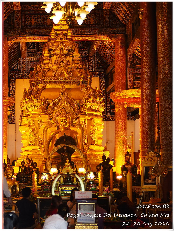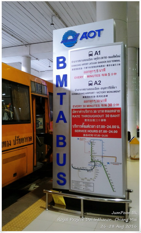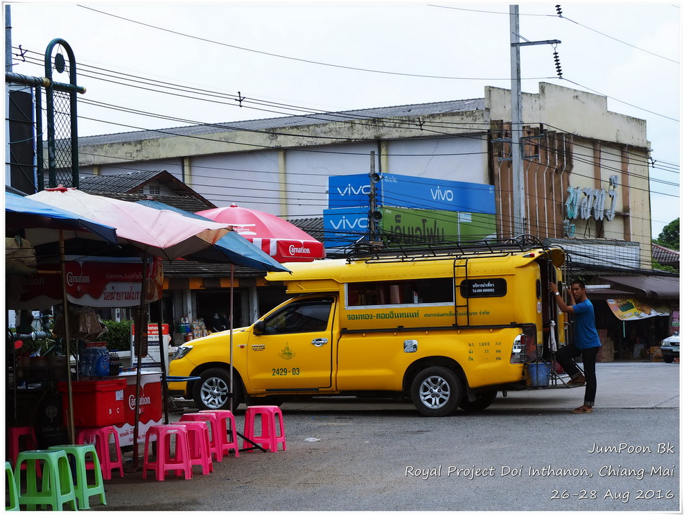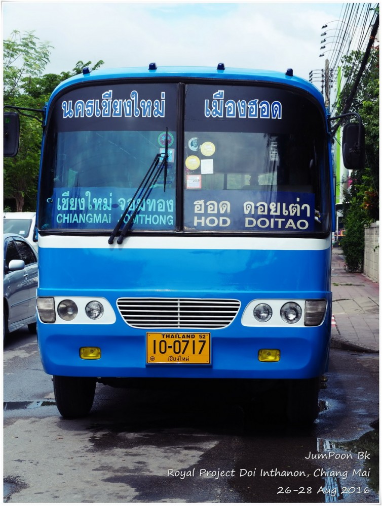 เริ่มเดินทางที่สนามบินดอนเมือง เที่ยวบินที่ FD-3445 เวลา 8.15 น. ถึงเชียงใหม่ 9.30 น. นั่งรถแดงหน้าสนามบินบอกว่าไปท่ารถจอมทอง คุณพี่รถแดงคิดราคาเหมา 150 บาท นั่งรถบัสสีฟ้าต่อไปอำเภอจอมทอง ถึงหน้าวัดพระธาตุศรีจอมทองวรวิหารใกล้ๆ เที่ยง เราหาข้าวกลางวันกินแถววัด แล้วเข้าไปสักการะพระธาตุซึ่งเป็นพระธาตุประจำปีเกิดปีชวดหรือปีหนู ที่หน้าวัดมีรถสีเหลืองขึ้นดอยอินทนนท์ มีหลายเจ้าให้เราเหมารถขึ้นไปโดยจะแวะสถานที่ท่องเที่ยวระหว่างทางให้ แต่เราไม่ต้องการ เราอยากขึ้นไปที่พักเลย สรุปเลยได้ราคาขึ้นไปสถานีเกษตรหลวงอินทนนท์คนละ 50 บาท ทั้งรถ มีแค่เรา 4 คนแหล่ะ ขึ้นไปได้สักพักก็เจอด่านของกรมอุทยาน เสียค่าเข้าคนละ 50 บาท ค่าธรรมเนียมรถอีก 30 บาท ด้วยความที่ระยะทางจากจอมทองไปสถานีเกษตรฯ มากกว่าที่เราคาดคิดพวกเราเลยทิปพี่คนขับรถไปอีก 200 บาท