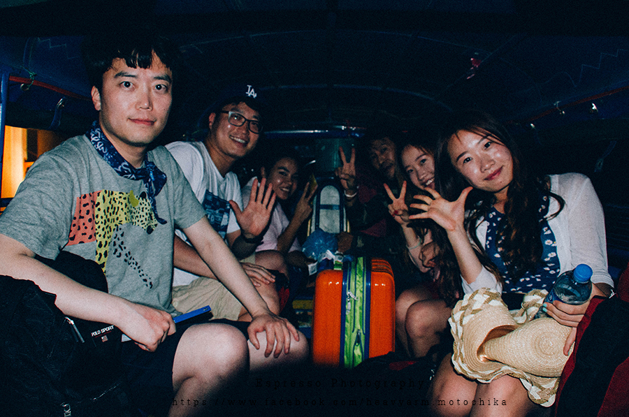 ผมและเพื่อนนัดโรงแรมมารับตอน 2 ทุ่ม แต่นี้มันเรทมากแล้ว ก็เลยต้องหารถไปเอง แต่ด้วยราคารถแถวนั้นที่มาดักรอนักท่องเที่ยว แน่นอนเค้าย่อมชาจราคาอยู่แล้ว ผมกับเพื่อนเลยทำอย่างที่ถนัดคือการผูกมิตร์กับคนใหม่ๆจะได้ร่วมเดินทางไปด้วยกัน และที่สำคัณมันประหยัดด้วย :D  และเราก็เจอ เป็นคนไทย 2 คนที่มาด้วยกัน คุยไปคุยมาได้ความว่าเค้าพักที่ใกล้เราเลย อื๊มดีสิงั้นติดไปด้วยกันเลยจะได้ถูกลงอีก  และก่อนหน้าที่ผมจะขึ้นรถไปนั้นเอง ก็เห็นกลุ่มนักเดินทางชาวเกาหลียืนเก้ๆกังๆอยู่ เลยเข้าไปคุยกับเค้าว่าไปด้วยกันมั้ยอะไรยังไง และก็แน่นอน พวกเราก็เลยตกลงไปด้วยกัน จริงๆ