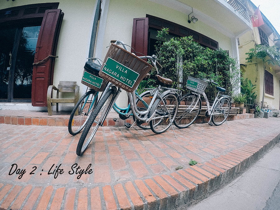 เช้าวันที่ 2 ของการออกเดินทาง ตื่นมาพร้อมกับความเมื่อล้าไปทั้งตัวจนแถบจะไม่อยากลุกออกจากเตียงเลย แต่ก็นะ เรามาเที่ยวนี้นาถ้าเราจะมานอนแช่อยู่บนเตียงทั้งวัน จะออกจากบ้านมาทำไมกันล่ะจริงมั้ย แผนการเดินทางของเราในวันนี้คือ ออกไปแลกตังจากเงินไทยเป็นเงินลาว และปั่นจักรยานรอบเมืองชมวิถีชีวิตของชาวหลวงพระบางก่อนแล้วพอ 11 โมงกลับมาที่พักเพื่อเตรียมขึ้นรถที่จะไปน้ำตก กวานสี กัน และตกเย็นค่อยมาเดินตลาดกลางคืน คิดได้ดังนั้นก็รีบลุกจากเตียงไปทำทุระส่วนตัวแล้วลงไปทานอาหารเช้าที่ทางโรงแรมจัดเตรียมเอาไว้ให้