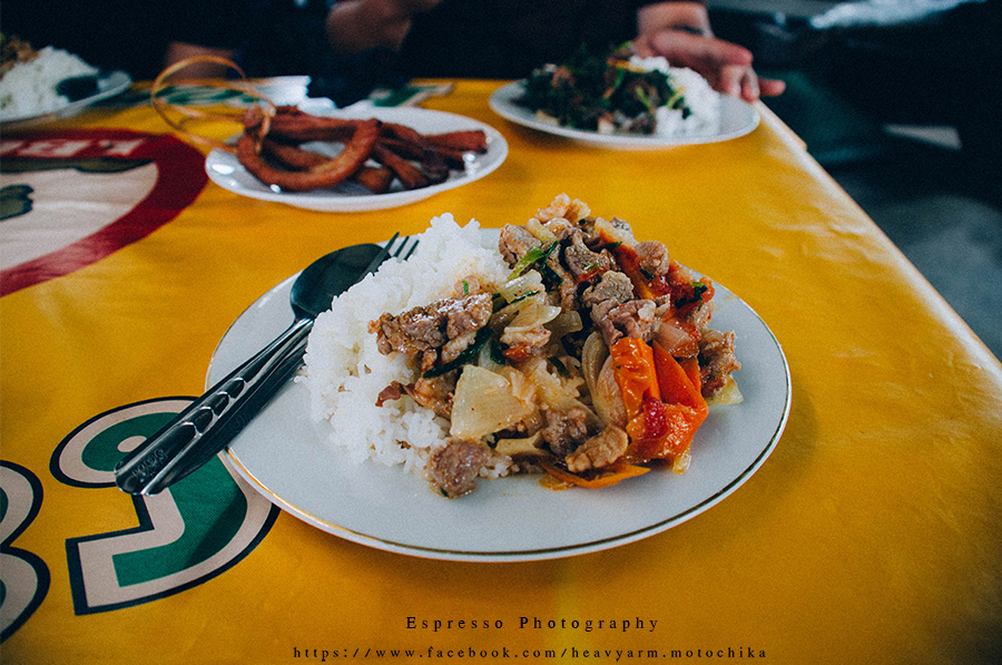 นั่งรถประมาณ 1 ชั่วโมง ก็มาถึง บขส สายเหนือของ นครหลวงเวียงจันทร์ เอ๊าละหาอะไรใส่ท้องหน่อยดีกว่า ตั้งแต่เช้ายังไม่ได้กินอะไรเลย หิวโคตร!!! และนี้ก็คือกับข้าวมื้อแรก ผัดอะไรก็ไม่รู้ กับหมูทอด ที่แข็งยิ่งกว่ากระดูกต้นขาของ แร็ปเตอร์ - -