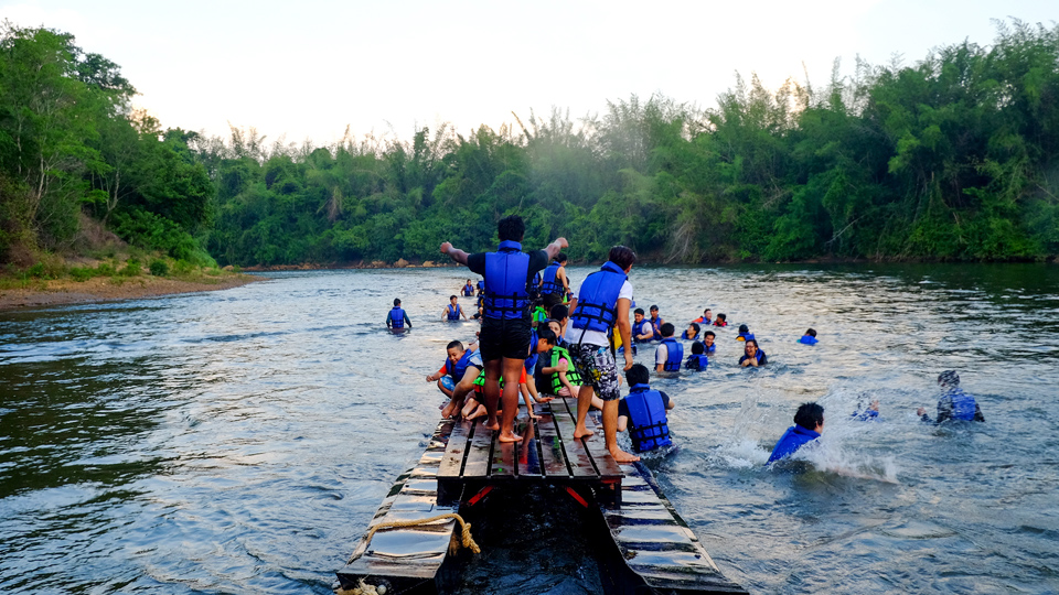 กิจกรรมที่ทางสวนไทรโยค รีสอร์ท โดยใช้วิถีชาวกาญจน์ ในการใช้แพเป็นหลัก มาประยุกต์กับกิจกรรม Adventure โดยลาก แพเป็นขบวนทวนแม่น้ำแควน้อย 2 กม. แล้วปล่อยแพล่องจากน้ำอิสระ โดยผู้เล่นจะสวมเสื้อชูชีพ แล้วกระโดดลงน้ำลอยตัวมาขึ้นที่รีสอร์ทหรือบนแพ พร้อมชมวิวสะพานถ้ำกระแซได้ตลอดตั้งแต่แรกจนจบ โดยมีเจ้าหน้าที่ควบคุมความปลอดภัยให้กับทุกท่าน เนื่องจากที่ตั้งรีสอร์ทเป็นแน้วโค้งรับน้ำยาวกว่า 500 เมตร ท่านจึงสะดวกสบายในการขึ้นจากแม่น้ำ
