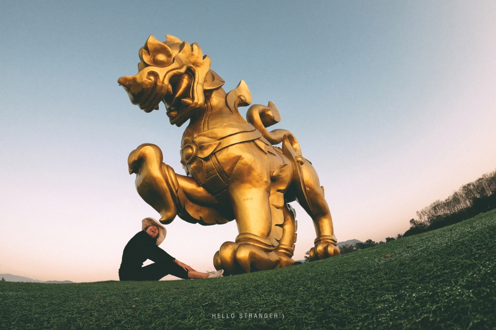 01 ถ่ายรูปคู่รูปปั้นสิงห์สีทองขนาดใหญ่