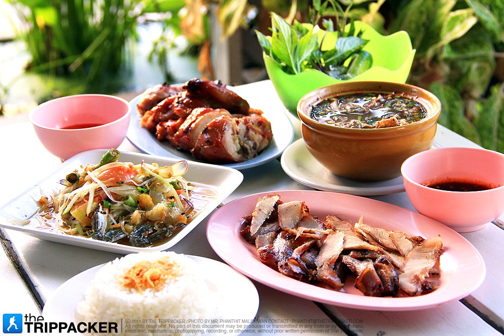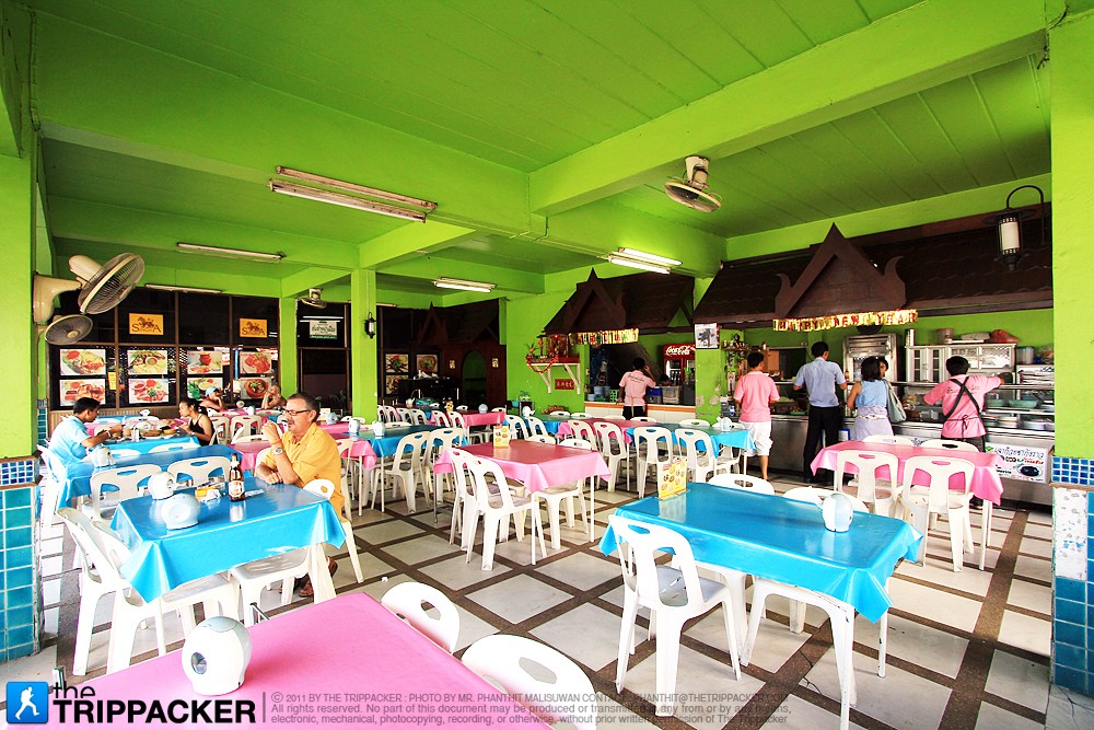 บรรยากาศภายในร้านต้องบอกว่า สีสันสดใสมากๆ ทั้งผนังสีเขียวสด และโต๊ะจำนวนมากที่ถูกปูทับด้วยผ้าปูโต๊ะสีฟ้าและสีชมพู เพิ่มความสดใสให้กับร้านได้มากเลยทีเดียว ทันทีที่เราเลือกได้โต๊ะที่เหมาะๆ ในมุมหนึ่งของร้านแล้ว เราก็เริ่มสั่งเมนูเด็ดประจำร้านแทบจะในทันที และแน่นอนว่ามาถึงร้านส้มตำ จะขาดส้มตำไปได้อย่างไร ต้องสั่งมาลองชิมดูซักจานไม่เช่นนั้นก็คงจะเรียกว่ามาเสียเที่ยว รอไม่กี่อึดใจ เมนูทั้งหมดก็ถูกลำเลียงมาวางไว้เต็มโต๊ะ แล้วก็ถึงเวลาลิ้มรสชาติของอาหารแต่ละจานกันแล้ว
