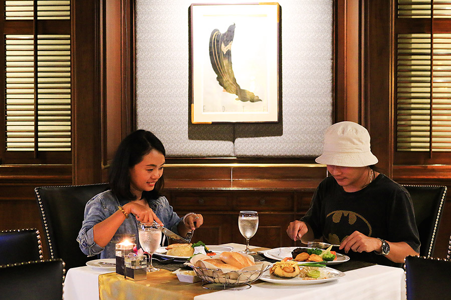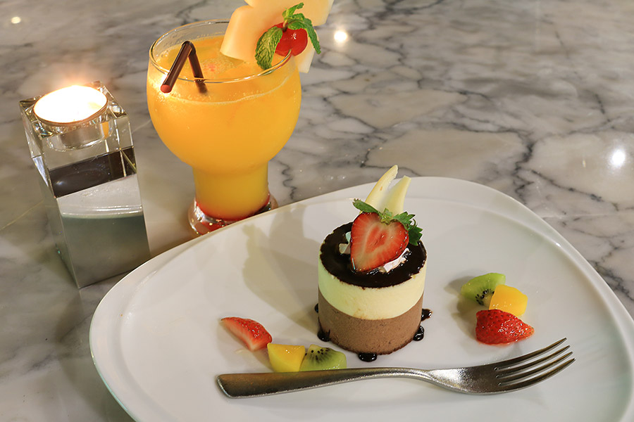 เราทานดินเนอร์กันที่นี่ เชฟอำนาจ จากเวฟ โฮเทล ตามมาบริการถึงที่ แซลมอนรมควัน สเต็กไก่ สเต็กเนื้อ ผัดไทกุ้งสด ตบด้วยของหวานแบล็ค แอนด์ ไวท์ มูส ทานพร้อมกับค็อกเทลเบาๆ สองแก้ว ค็อกเทลกับของหวานเข้ากันอย่างเหลือเชื่อ ต้องบอกเลยครับว่านี่เป็นมื้อแรกในชีวิตที่ผมกับเธอได้ทานดินเนอร์โดยมีเสียเปียโนบรรเลงคลอเคลียให้ฟัง ไม่รู้จะใช้คำอะไรมาพรรณนาความสุขครั้งนี้ดี ในส่วนของอาหารเช้าเราทานกันที่ การ์เด้น เทอร์เรซ ไลน์ไม่จัดว่าล้นทะลักแต่ก็มีให้เลือกหลากหลายและเพียงพอ ห้องอาหารสวยดี บรรยากาศโอเค เลือกนั่งได้ทั้งโซนด้านในและด้านนอก ที่นี่มีน้ำผลไม้ปั่นสดๆ ให้ทานกันตามใจชอบด้วย