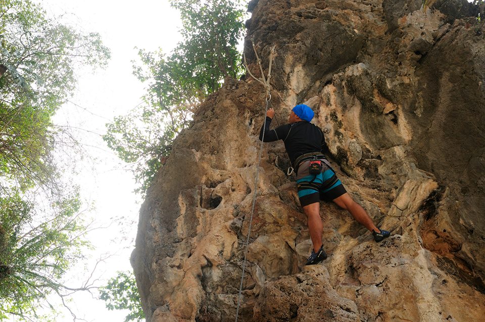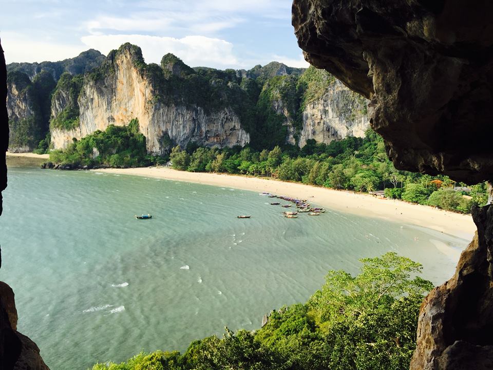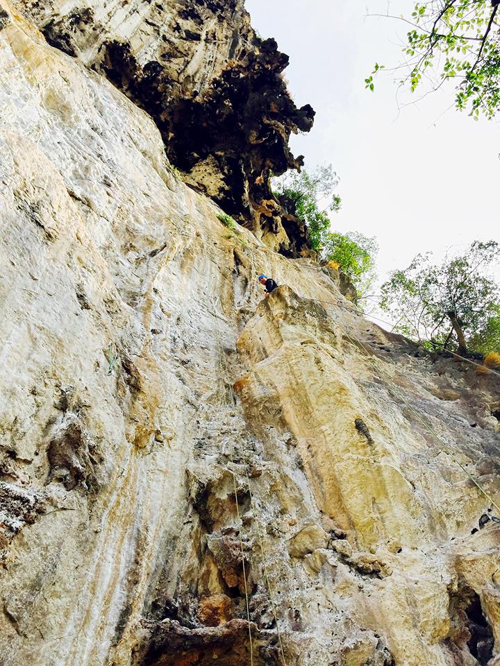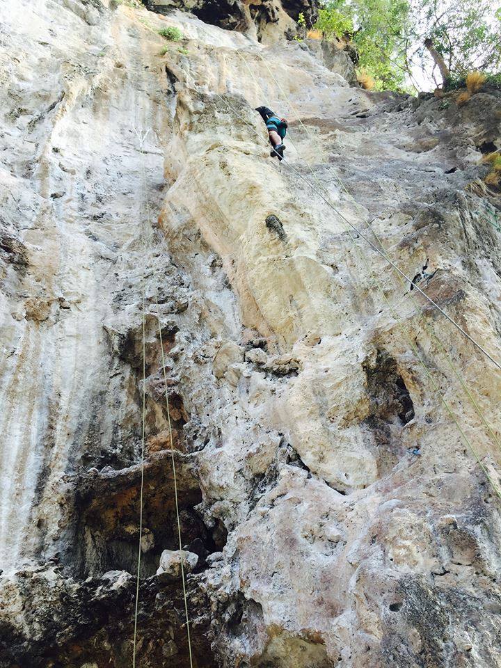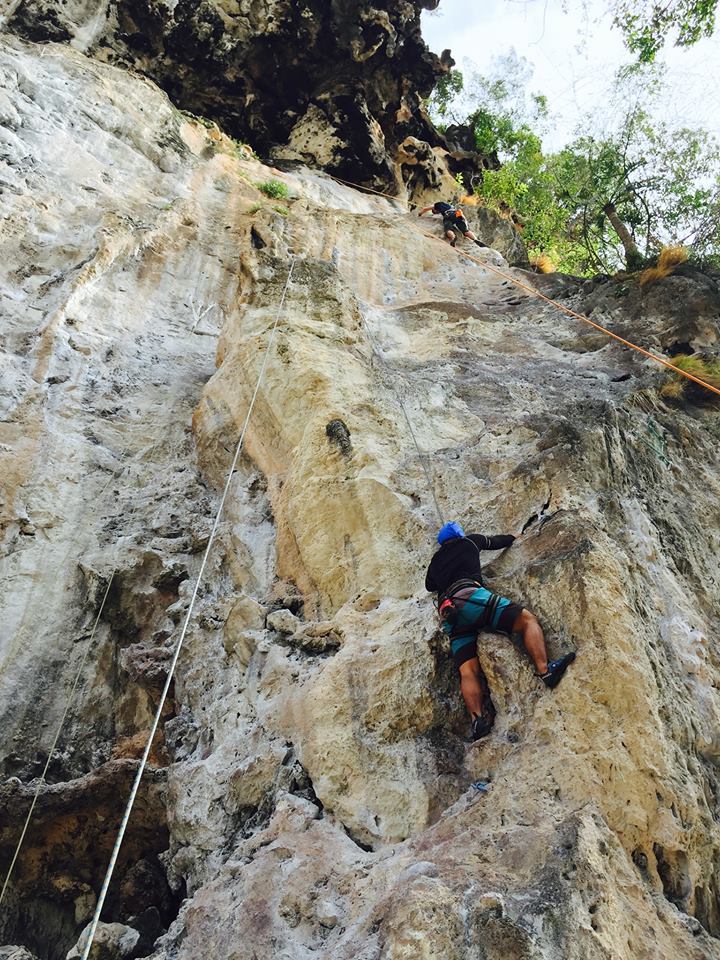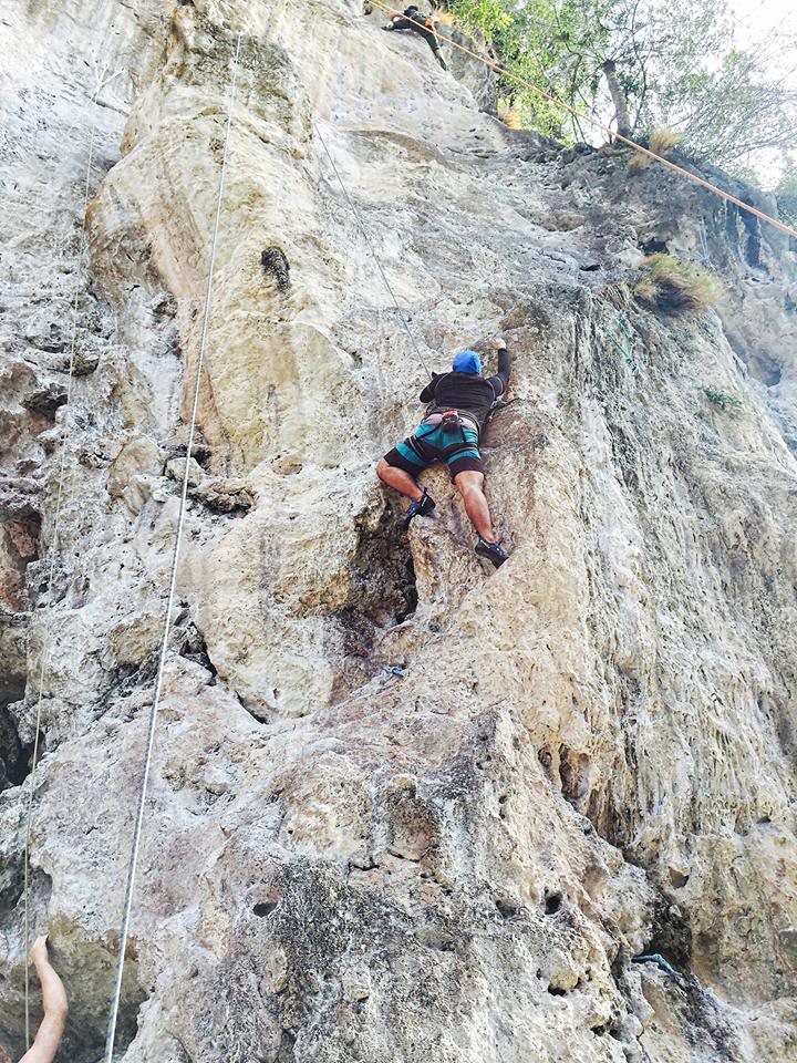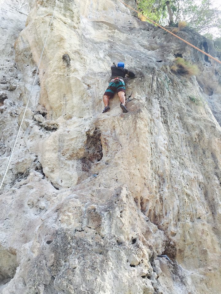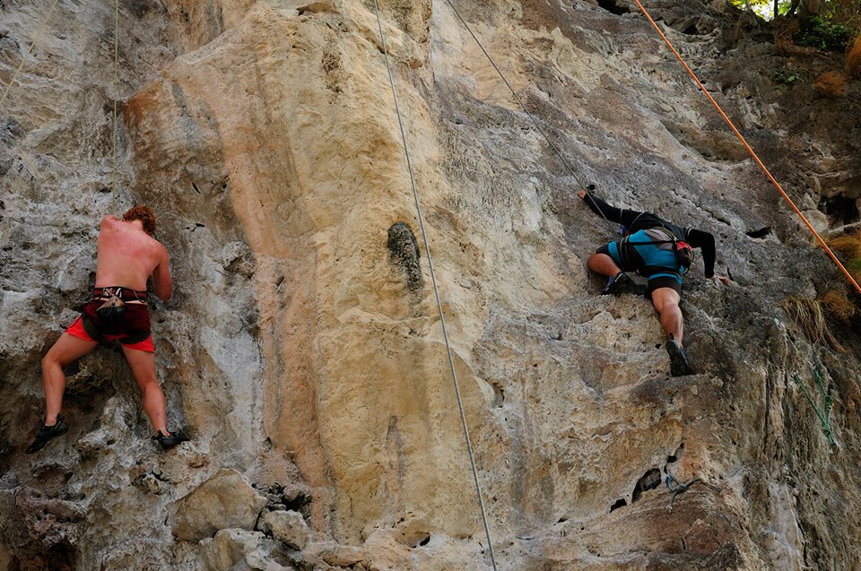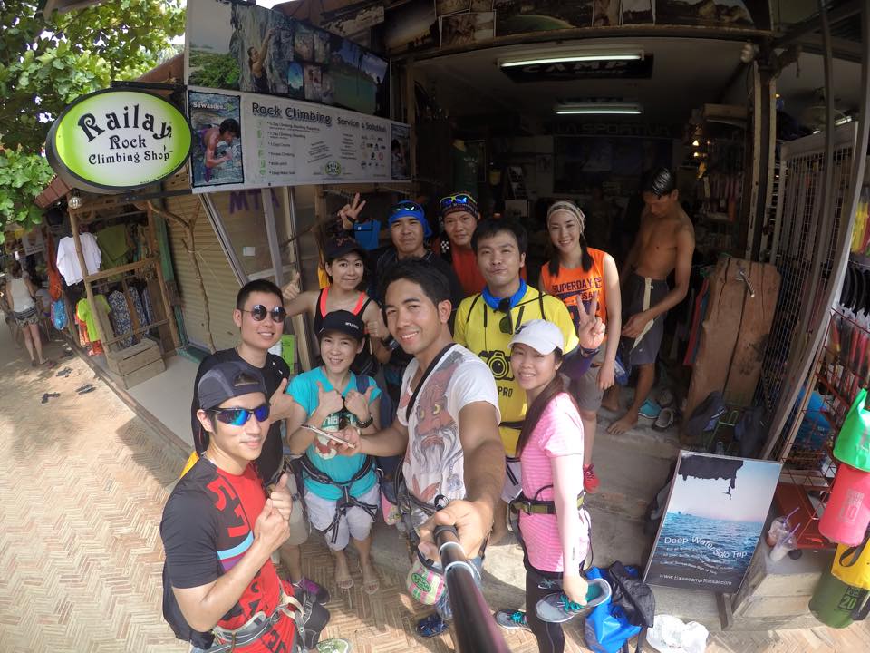 ช่วงบ่าย เรานั่งเรือไปที่หาดไร่เลย์ ไปยังร้านที่ให้บริการปีนหน้าผา เจ๊เจ้าของร้านถามพวกเราก่อนเลยว่า “มีใครไม่อยากปีนไหมคะ” พวกเราได้แต่ยืน งงๆ ยิ้มๆ เจ๊เลยสรุปว่า “โอเค อยากทุกคนนะคะ” จากนั้นเจ๊ก็จัดแจงอุปกรณ์ให้พวกเรา