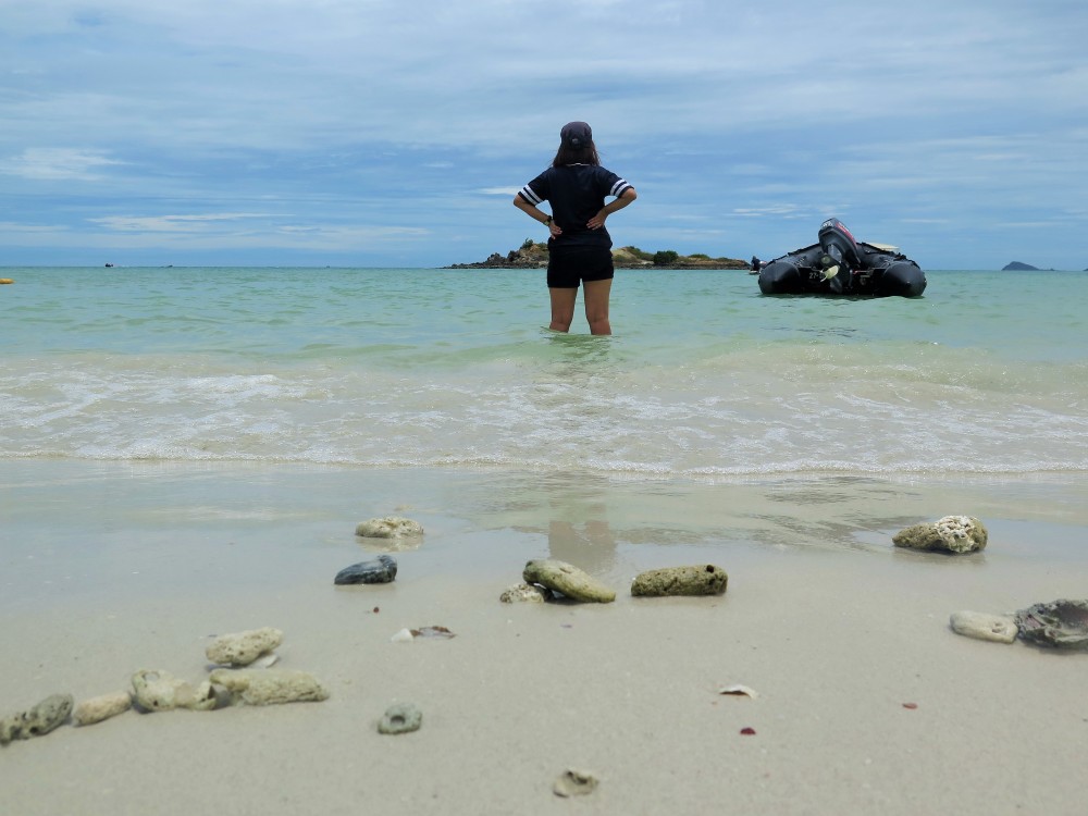 นั่งเล่นตรงหาดแสมสารไม่ทันไร ใจก็อยากไปนั่งเรือท้องกระจกชมปลาและปะการังเลยจะไปจองคิวที่หาดลูกลม ซึ่งห่างไปไม่เกิน 3 กิโลเมตร แต่ต้องอกหักเพราะเจ้าหน้าที่บอกว่าน้ำทะเลลดเยอะต้องรอประมาณบ่าย 2 ถึงจะไปได้