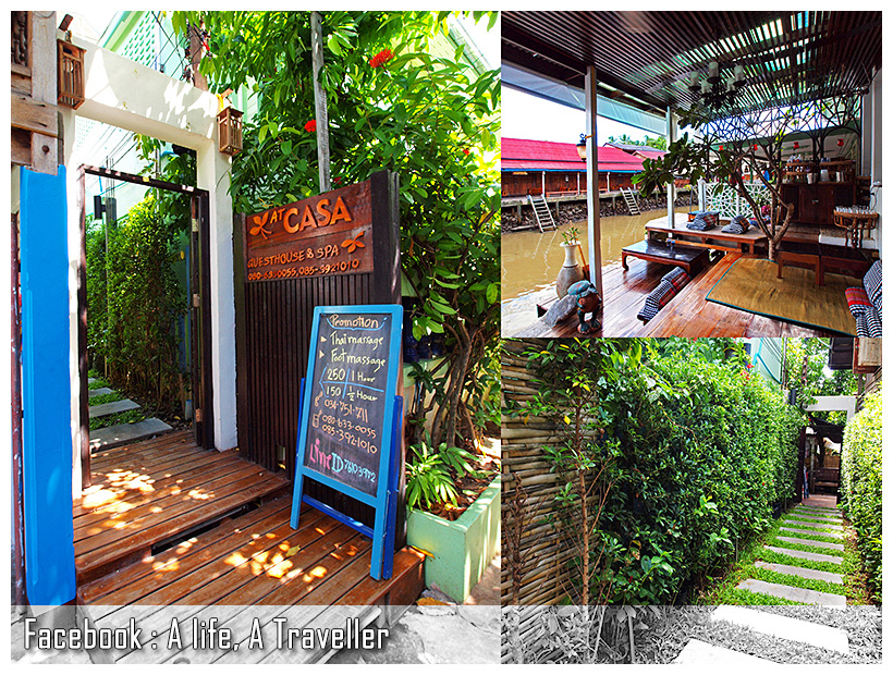 แอท คาซ่า ตั้งอยู่ริมคลองอัมพวาในชุมชนหลังโรงเจซำเป้า ห่างจากปลายตลาดน้ำแค่เดินสักสองสามนาที ใครขับรถมาสามารถจอดรถหน้าโรงเจ แต่เหมือนจะคิดค่าจอดรถนะครับ ส่วนผมนั่งรถตู้ตอนเที่ยงมาลงตรงวัดอัมพวันเจติยารามก่อนบ่ายสองนิดๆ จากนั้นโทรศัพท์เข้าไป เขาติดต่อให้รถสามล้อมารับส่งถึงที่เลย