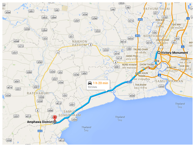 ทริปอัมพวาเดินทางจากกรุงเทพไม่ยากแม้ไม่มีรถส่วนตัว ถ้าจะให้ได้บรรยากาศต้องจับรถไฟจากวงเวียนใหญ่ไปลงมหาชัย ขึ้นเรือข้ามแม่น้ำท่าจีนไปต่อรถไฟที่สถานีบ้านแหลมจนสุดปลายทางสถานีแม่กลอง จากนั้นค่อยนั่งรถสองแถวแม่กลอง-อัมพวา แต่สำหรับผมทริปนี้ขอแบบรวดเร็ว (เพราะตื่นสาย) คือใช้บริการรถตู้ที่อนุสาวรีย์ชัย แล่นฉิวตามถนนพระรามที่ 2 เลี้ยวเข้าเมืองแม่กลอง แค่ชั่วโมงกว่าๆ