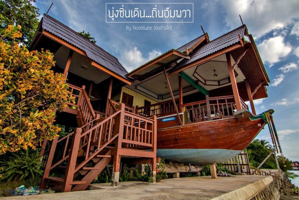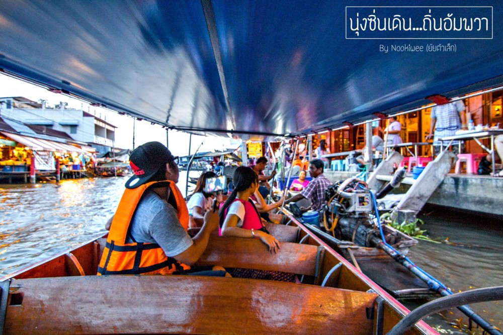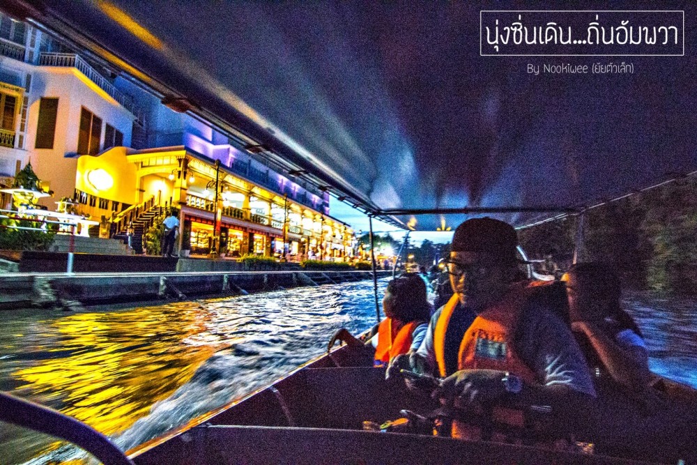 หลักจากดูดดื่มกับวิวบริเวณรีสอร์ทได้สักพักหนึ่ง จุดหมายของเราคือ การเดินไปตลาดอัมพวา เพราะจากข้อมูลที่ทราบมา รีสอร์ทนี้อยู่ห่างจากตลาดน้ำ ประมาณ 400 เมตร เเต่เจ้าของรีสอร์ทเเนะนำเราให้ไปทางเรือจะดีกว่า สะดวกรวดเร็ว เเละตบท้ายด้วยการนั่งเรือชมหิ่งห้อยอัมพวา ซึ่งช่วงเดือนสิงหาเค้าว่ากันว่า เป็นเดือนที่มีหิ่งห้อยเยอะที่สุด เเต่เราก็ไม่รู้หรอกว่า หิ่งห้อยจริงหรือไม่จริง เพราะเคยอ่านๆดูหลายคนบอกว่าเป็นเเสงไฟที่เค้าเอามาเเต่งไว้ พวกเราตกลงเหมาเรือไปตลาดอัมพวา 700 บาทไทย โชคดีที่มาหลายคน หารๆกันเเล้วก็ยังอุ่นใจ ^^
