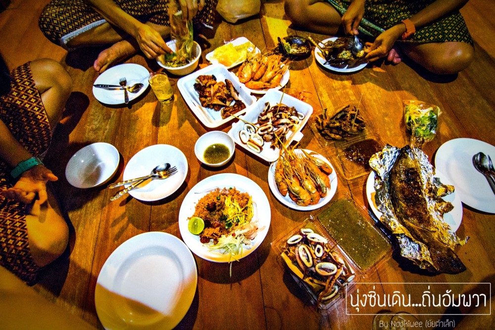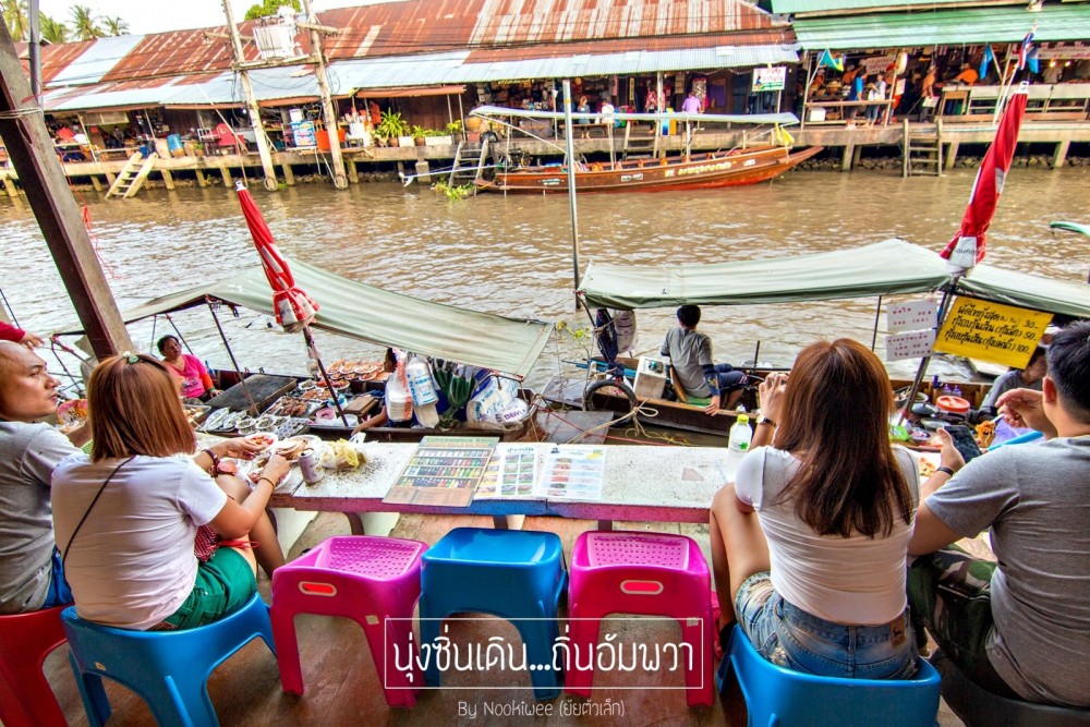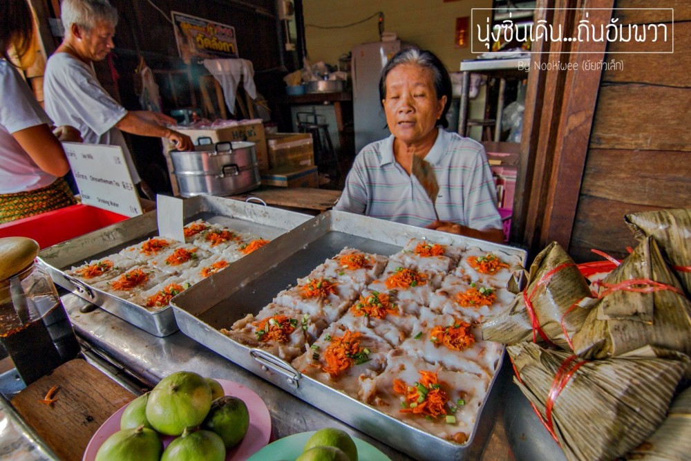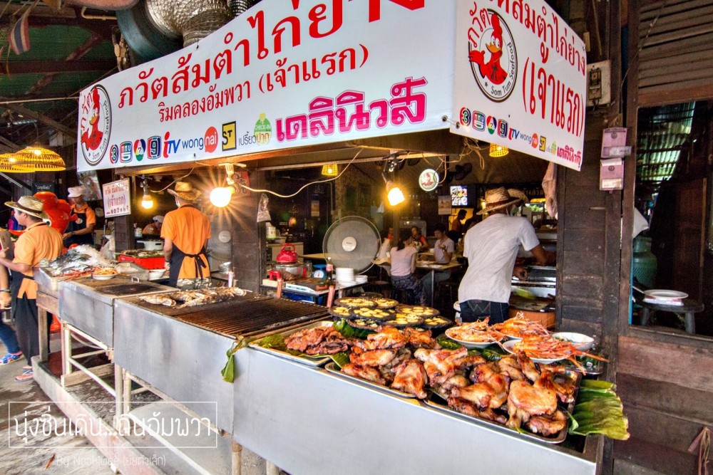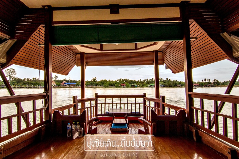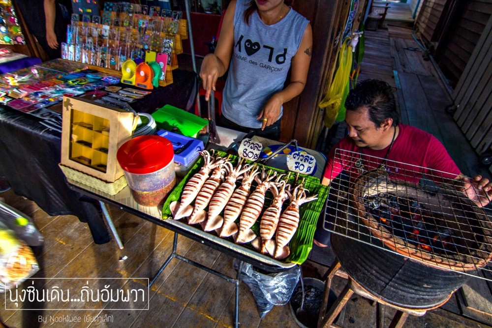 เสน่ห์อีกอย่างนึงของอัมพวา คือ เรือขายของ  ขายทุกอย่าง ส่วนใหญ่จะเป็นอาหาร ก๋วยเตี๋ยวเรือ นี่สิก๋วยเตี๋ยวเรือจริงๆ  อัมพวาจะมีชานริมน้ำ ให้ลูกค้าสั่งอาหารเเล้วกินริ่มฝั่งได้เลย  หรือ ถ้าบางคนคิดว่ามันลำบาก ก็มีร้านอาหารที่ตกเเต่งสวยๆ ให้หลงๆเข้าไปทาน (เเต่ราคาก็สูงอยู่นะซึ่งไม่เหมาะกับเราเอาเสียเลย 555 )