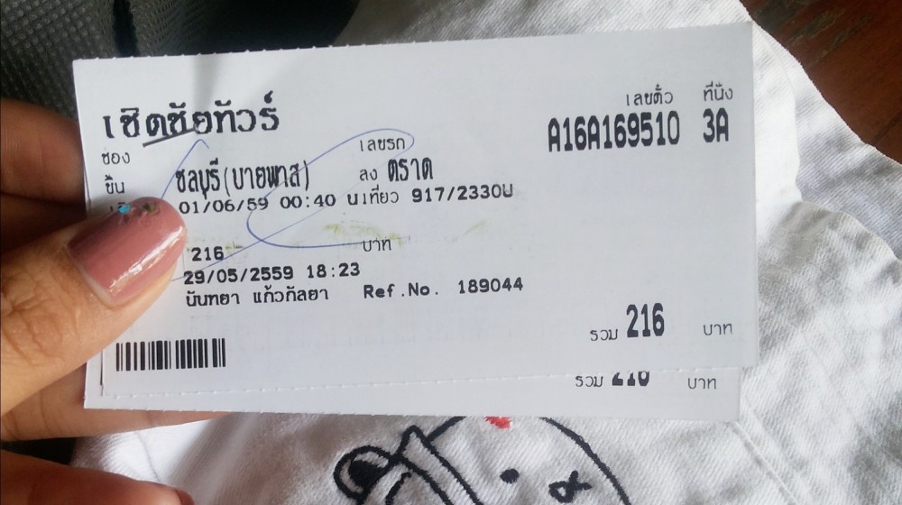 เราได้จองตั๋วรถของเชิดชัยทัวร์ กรุงเทพ-ตราด วันที่1/06/2559 เวลา00.40 ราคา 216 บาท