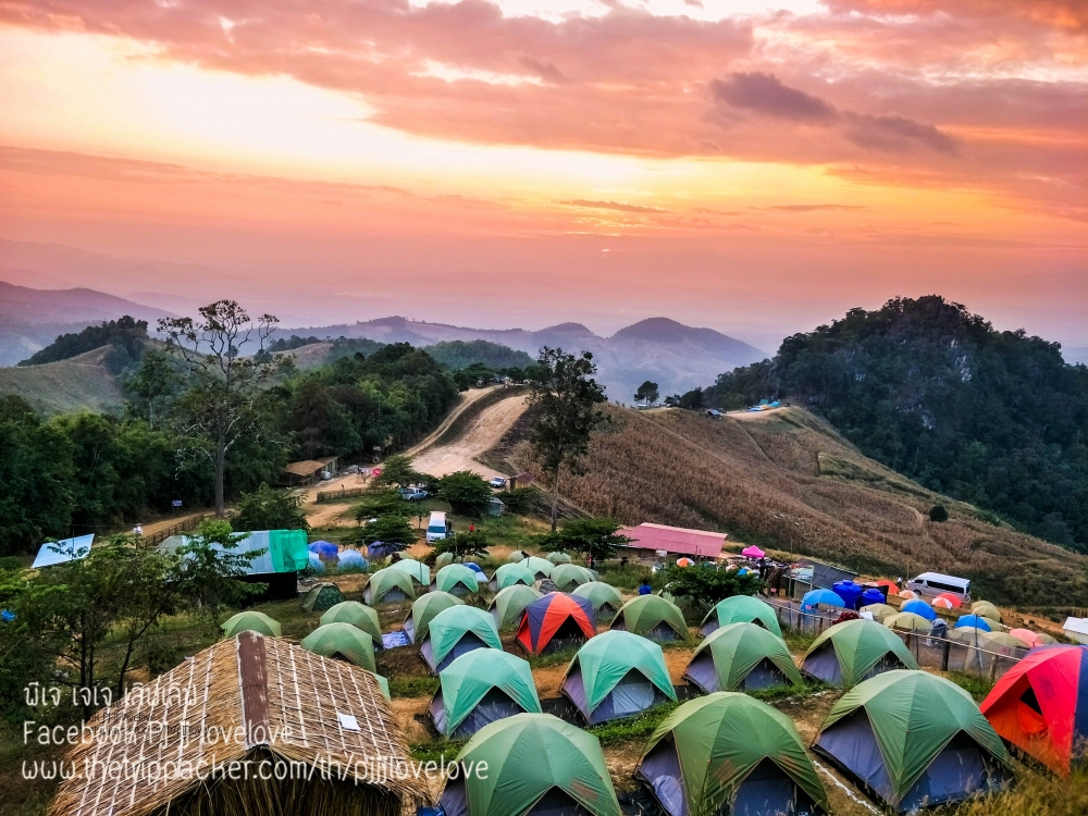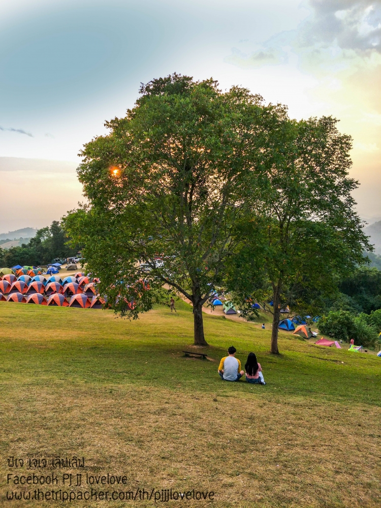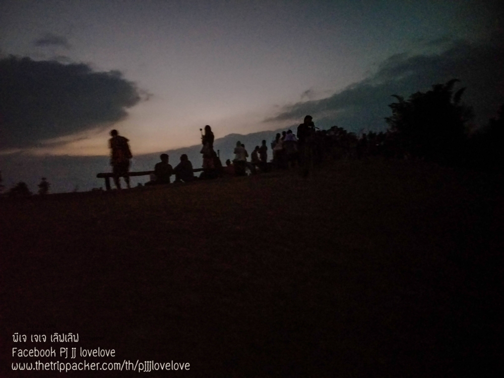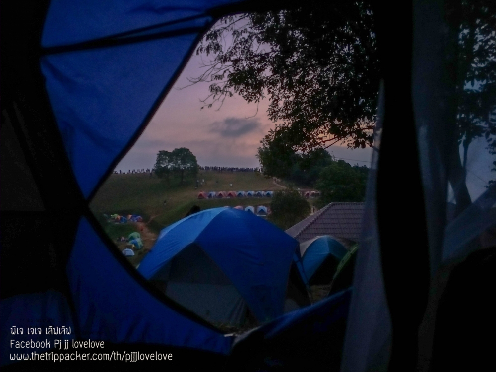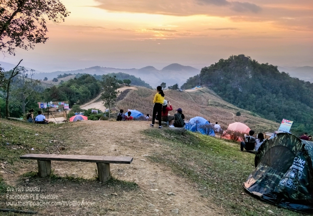 บรรยากาศพระอาทิตย์กำลังตกดิน กับผู้คนที่มาท่องเที่ยว บ้างก็ทยอยจัดข้าวของ ในเต้นท์และเตรียมทำอาหารกินกัน บางคนก็ขึ้นมานั่งชมวิวธรรมชาติ นั่งคุยกันเป็นคู่ๆ เป็นกลุ่มๆ หลายสำเนียง หลายภาษา มีทั้งอีสาน เหนือ และใต้