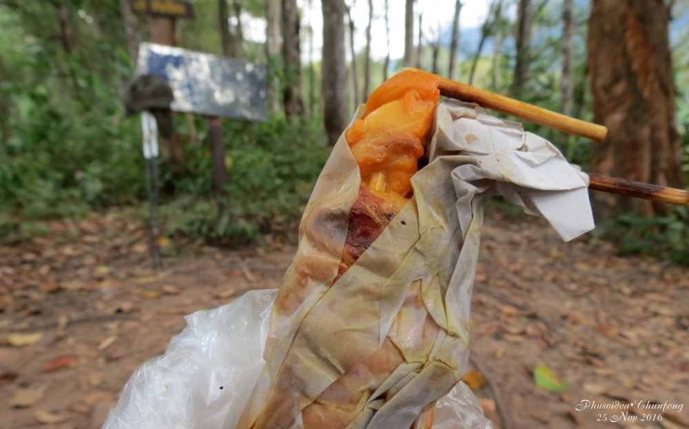 เดินแบกของมาคนเดียว (555 ลืมบอก ว่าผมเดินแบกของเองรวม 15 กิโล ไม่ต้องบ้าพลังเหมือนผมนะครับ) ต่อไปเรื่อยๆ จากเนินส่งญาติ (ความชันพอๆกันกับเนินมรณะ) ผ่านอีกหลายเนินแบบไม่รู้ตัว ป้ายชื่อเนินต่างๆ ไม่มองหา เพราะเดินแบบขาดสติมาก ระหว่างทางก็แวะเติมพลังด้วยไก่ย่างจากตลาดสด สภาพเยินสุดๆ แต่ก็กินได้อยู๋ (ณ จุดนั้น ผมกินไม่เหลือให้ติดไม้เสียบเลยทีเดียว)
