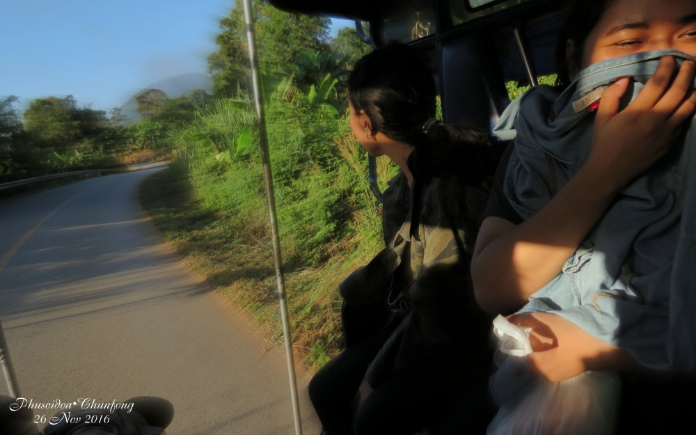 ในการเดินทางครั้งนี้ คณะเราได้นัดรวมพลกันที่ บขส.ใหม่ พิษณุโลก และเหมารถสองแถว (หาได้ตามเพจของ Facebook และ เว็ปไซต์) ที่ได้นัดไว้ หลังจากรวมพล ล้อหมุนเวลา 4.30 น. โดยประมาณ พลขับใช้ความชำนาญทางในความมืด ขับแบบไม่แคร์ว่าพวกเราจะหนาวเลย (พี่ชาย หนาววว หนาวววเหลือเกิ้นนนน)....ลมตอนช่วงเช้ามืด เล่นเอาสั่นตลอดทาง..5555 (ภาพไม่มี เพราะมืดและหนาวมาก)...พอมีแสงเช้ามากพอที่จะถ่าย ได้ภาพเยี่ยงนี้..