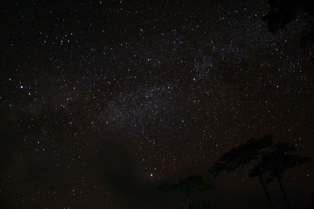 ผมโชกดีอย่างหนึ่ง ช่วงที่ผมาในปฏิทิน เป็นวัน แรม 4 ค่ำ ซื้งเป็นช่วงหลังจากออกพรรษา ผมก็หวั่นใจว่าถ้าพระจันทร์มาก็จบเลยทางช้างเผือกที่สวยงามจะโดนกลบด้วยแสงจากพระจันทร์ แต่แล้ว พระจันทร์แอบไปหลบที่ไหนไม่รู้ครับ 55 ดวงดาวเรียงตัวกันเป็นเส้นยาวพาดผ่านขอบฟ้า ภาพตรงหน้ามันทำให้ผมยิ้มครับ ยิ้มในความมืดเหมือนคนโรคจิตร555 ฟินนนมากกกกกก!!!