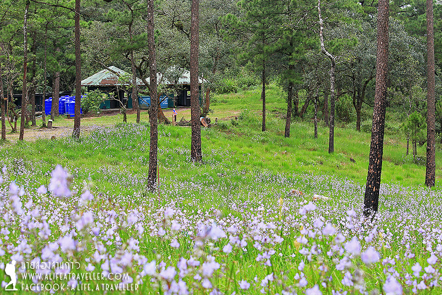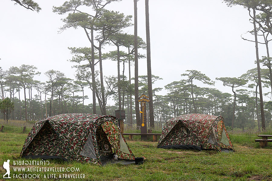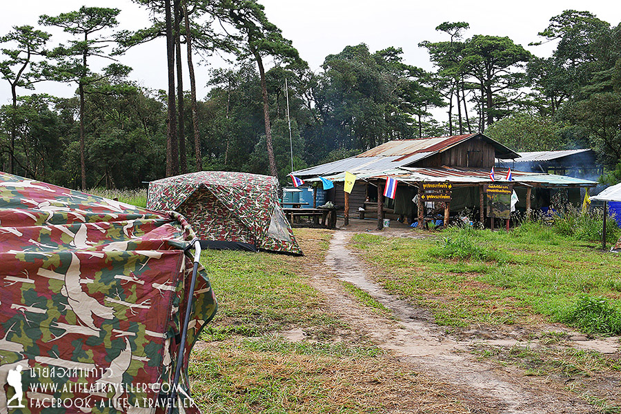 จากป้ายนี้เดินอีกนิดเดียวก็ถึงที่กางเต็นท์ ภารกิจที่พวกเราต้องรีบทำคือเบิกเช่าอุปกรณ์จำเป็นต่างๆ ในการใช้ชีวิตบนภูสอยดาว ถังกับขันสำหรับตักน้ำมาใช้เข้าห้องน้ำ เตากับถ่านสำหรับหุงข้าว (มีเตาแก๊สและแก๊สกระป๋องด้วยนะ เลือกตามถนัดได้เลย) และจากนั้นก็หาที่กางเต็นท์ เราสามคนมีเต็นท์หนึ่งหลัง เปลอีกสอง
