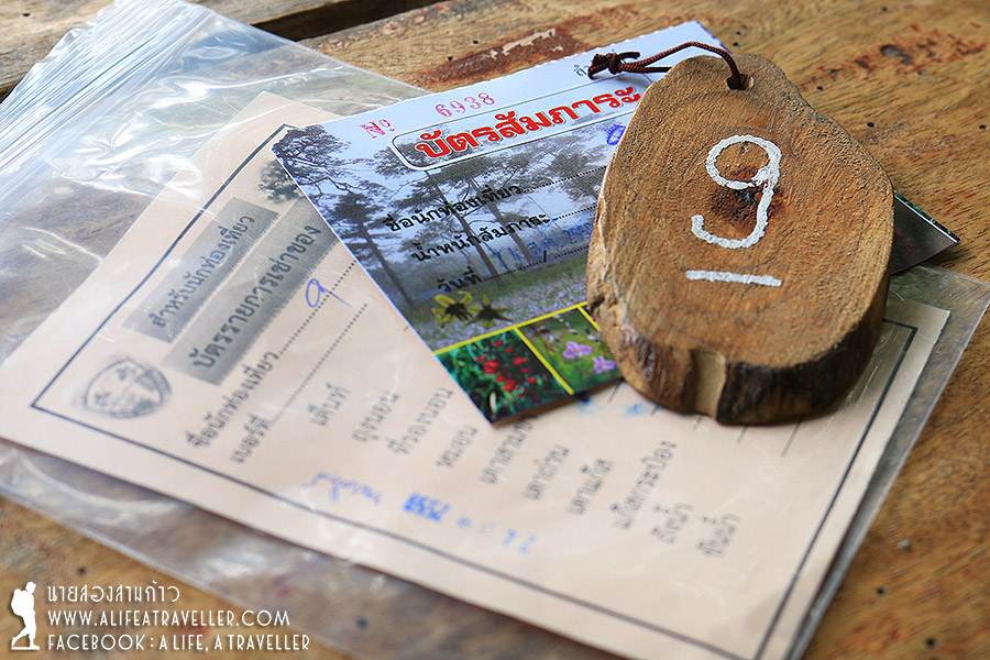 อ้อ... บอกนิดครับว่าเราเลือกเช่าเต็นท์และเครื่องนอนต่างๆ ได้สองแบบ อย่างแรกคือรับของด้านล่างที่ศูนย์บริการนักท่องเที่ยว แบบนี้เสียแค่ค่าเช่าแต่เราต้องแบกขึ้นเอง อย่างที่สองคือรับของด้านบน นอกจากค่าเช่าปกติจะบวกเพิ่มค่าลูกหาบตามน้ำหนักสิ่งของด้วย (แม้จริงๆ ของจะอยู่ข้างบนภูแล้วก็ตาม)