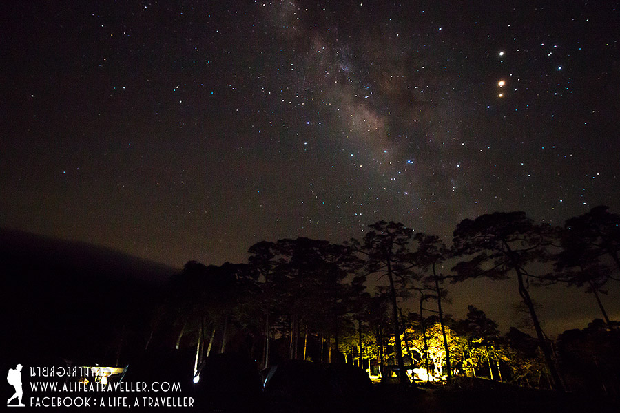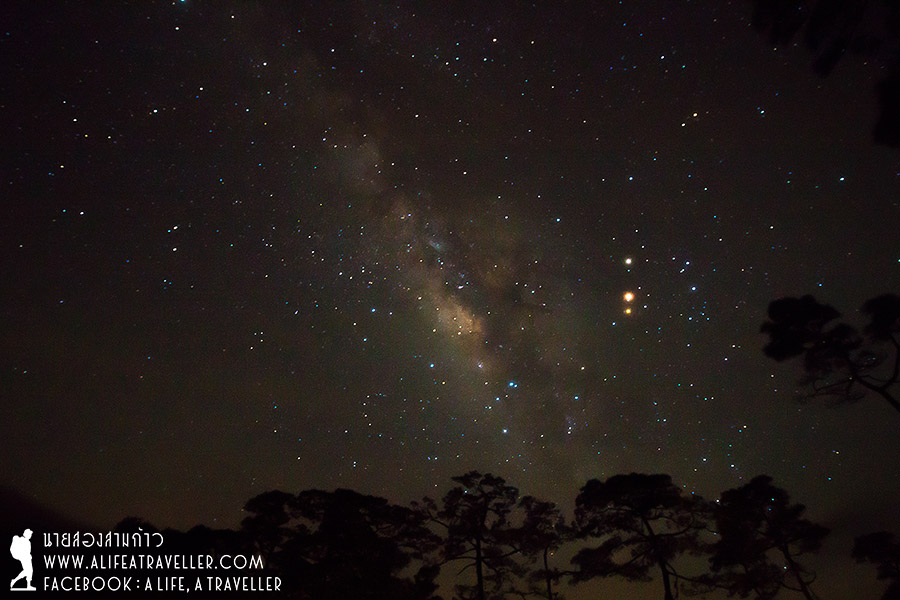 ใกล้สองทุ่มฟ้ามืดสนิท แหงนหน้ามองฟ้าดาวพราวระยับ จากข้อมูลที่รู้คือช่วงนี้ทางช้างเผือกขึ้นทางทิศตะวันตกเฉียงใต้ตอนหัวค่ำ ผมออกมายืนตรงลานกว้างหันหน้าเข้าหามุมที่พระอาทิตย์เพิ่งตก ยกมือซ้ายขึ้นแล้วหมุนคอตาม... นั่นเลยสุดยอด แค่เพียงตาเปล่าก็เห็นช้างเผือกกลุ่มสีขาวเป็นทางยาว