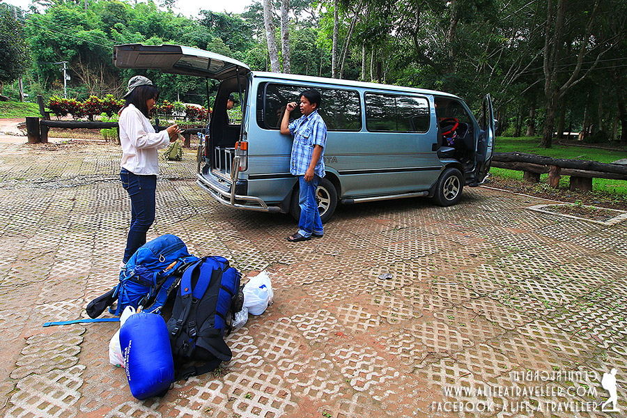 7.40 น. มาถึงหน้าป้อมตำรวจบ้านศรีสงคราม ตำบลป่าแดง อำเภอชาติตระการ มีรถตู้มาจอดรออยู่แล้ว ลงรถโดยสารปุ๊บ หยิบกระเป๋าลงปั๊บ ขนของขึ้นรถตู้ทันทีจนผมเกือบเหวอต้องโร่เข้าไปถามราคากับลุงคนขับรถตู้ “แปดคนใช่มั้ย ลุงคิดพันนึง” ลุงแกว่า บวกลบคูณหารเท่ากับคนละร้อยนิดๆ ค่อยโล่งอกหน่อย ราคามาตรฐานไม่โดนฟันให้เสียความรู้สึก (ใครมาคนสองคนจะใช้บริการสองแถว ดูข้อมูลการเดินทางได้ตอนท้ายครับ)