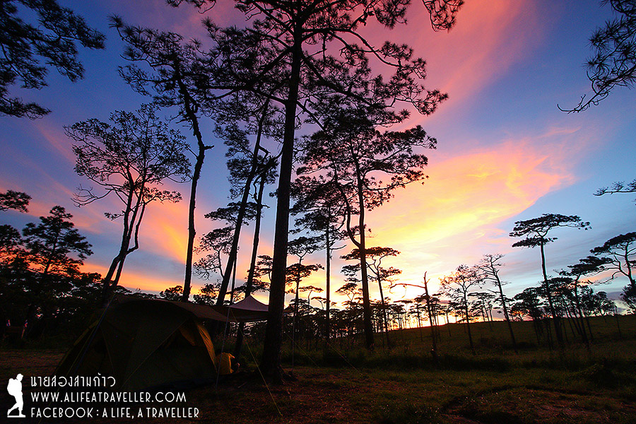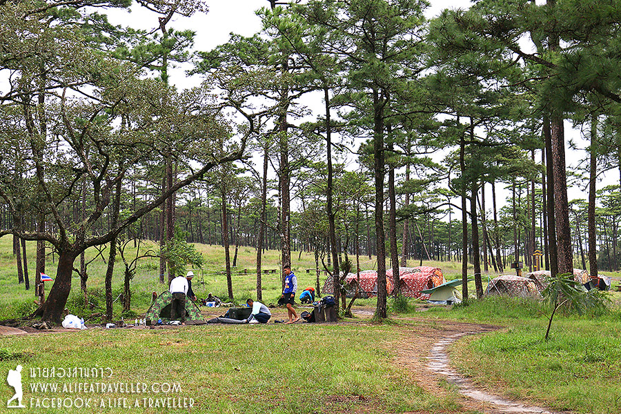 เทียบกับอีกหนึ่งภูยอดฮิตคือภูกระดึง ลานกางเต็นท์ที่ภูสอยดาวมีขนาดไม่ใหญ่ แต่ด้วยเราขึ้นมาวันธรรมดา นักท่องเที่ยวทั้งหมดแค่สิบกว่าคน พื้นที่น้อยๆ จึงดูกว้างขวาง พอหาทำเลได้แล้วก็ช่วยกันเตรียมที่ทางให้เรียบร้อย