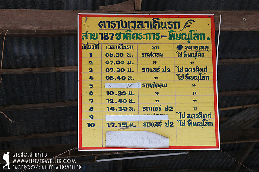 ขามาแปดคนลุงคิดพันนึง ขากลับเหลือสามคนลุงคิดแปดร้อย ตกคนละสองร้อยกว่าบาท เทียบกับระยะทาง 70 กิโลเมตร ถือว่าไม่แพงเกินไปนะ ลุงขับมาส่งเราที่จุดขึ้นรถชาติตระการ-พิษณุโลก เที่ยวรถช่วงบ่ายมีแค่สองรอบคือ บ่ายสองครึ่ง กับห้าโมงสิบห้า ดังนั้นแนะนำว่าถ้าต้องนั่งรถโดยสารกลับ หากไม่รีบลงแต่เช้าตรู่ก็รอลงสักสิบเอ็ดโมงจะดีกว่า ไม่อย่างนั้นต้องมาเสียเวลารอรถเหมือนพวกเรา