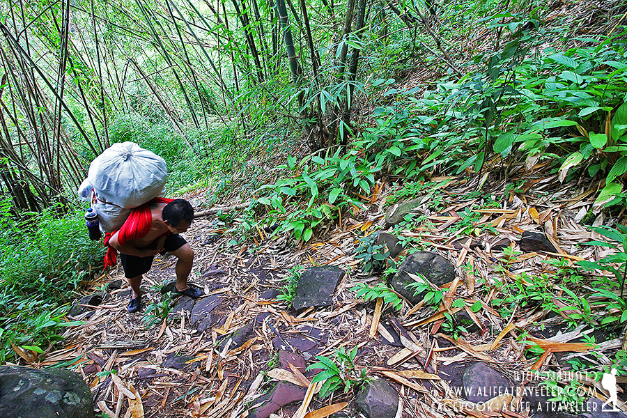 สัมภาระของผมชักถ่วงหลังมากขึ้นเรื่อยๆ ประมาณเที่ยงต้องปลดลงจากบ่านั่งพักกินข้าวโดยยังไม่พ้นเนินส่งญาติกันเลย กลุ่มนายร้อยที่ตามหลังมาแซงหน้าไปเรียบร้อย เช่นเดียวกับนักท่องเที่ยวสองคนอีกสองกลุ่ม รวมถึงลูกหาบหนุ่มอีกสองคน และลุงลูกหาบคนนี้อีกหนึ่ง กลายเป็นสิบสองคนแล้วครับที่แซงหน้าเราไป (ฮา...)